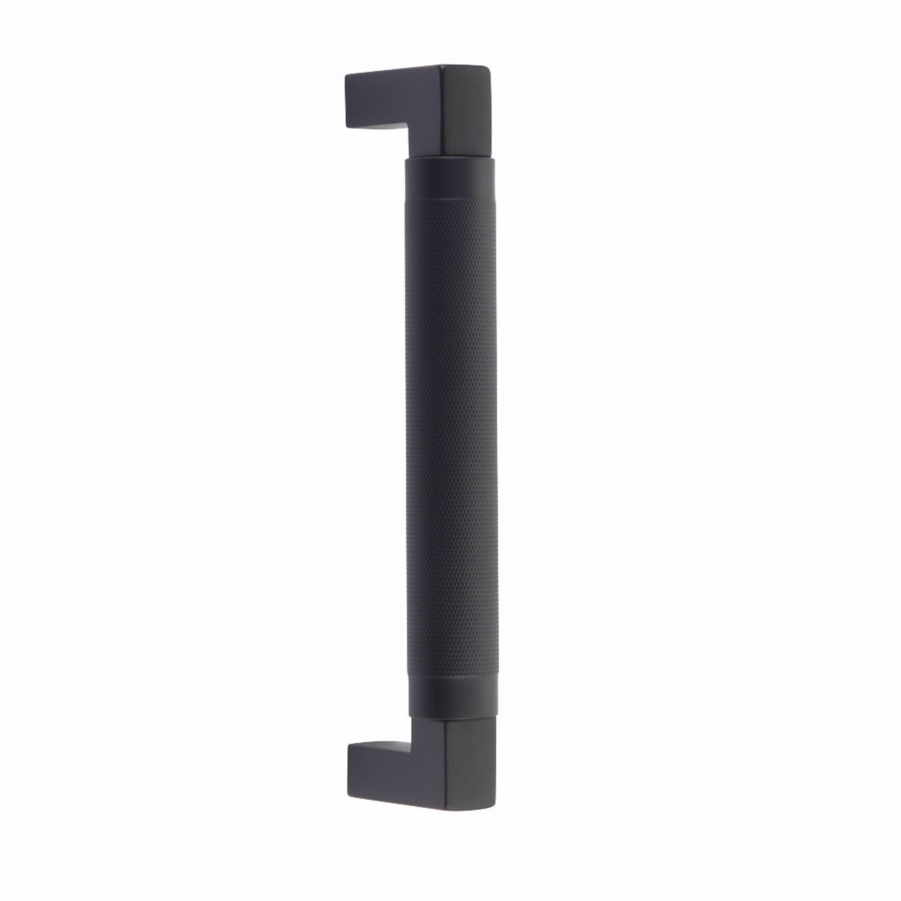 This door pull is constructed from solid brass and measures 8 5/8 inches end-to-end by 1 1/16 inches wide. Its projection is 2 1/4 inches and its center-to-center measurement is 8 inches. Available in Polished Brass, Satin Brass, French Antique, Oil Rubbed Bronze, Polished Nickel, Satin Nickel, Pewter, Flat Black and Polished Chrome.