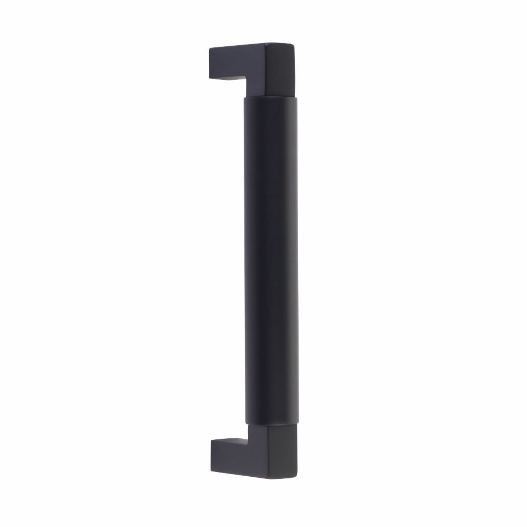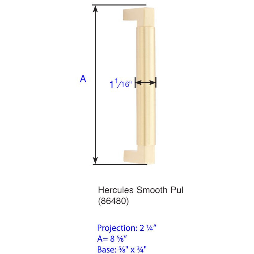 This door pull is constructed from solid brass and measures 8 5/8 inches end-to-end by 1 1/16 inches wide. Its projection is 2 1/4 inches and its center-to-center measurement is 8 inches. Available in Polished Brass, Satin Brass, French Antique, Oil Rubbed Bronze, Polished Nickel, Satin Nickel, Pewter, Flat Black and Polished Chrome.