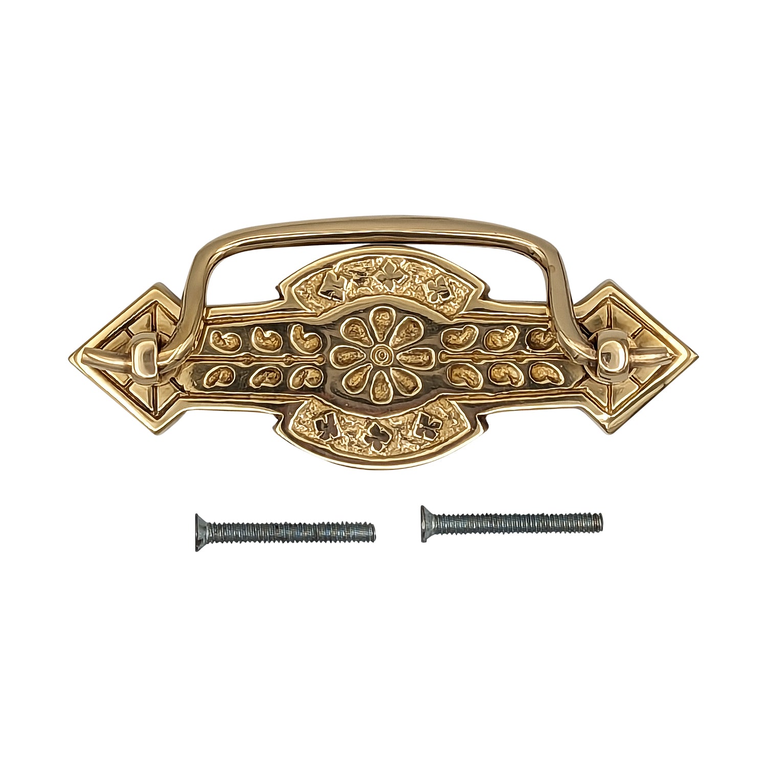 These bail pulls are made from solid brass and they are made the old fashioned way. We pour molten brass into highly detailed sand cast molds - and then grind and polish the pieces by hand. The mounting screws are solid steel - just like they were made a hundred years ago.