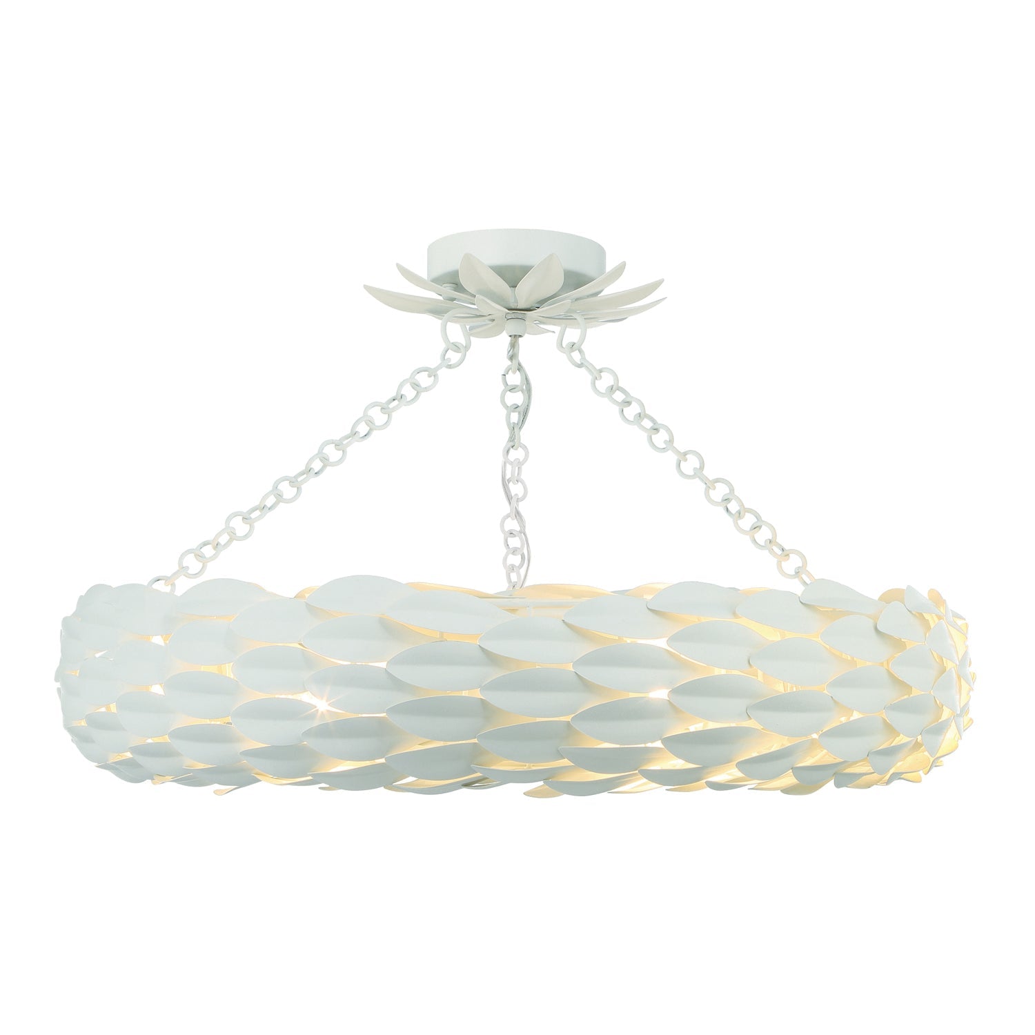 Layers of individual wrought iron leaves deliver a stunning, unique, and functional light. The tailored elegance of the shimmering metallic florals is perfect for a transitional home though versatile enough to be incorporated into any modern design. While ideal for a bedroom, living area, or kitchen, it can be used anywhere you want to add a bit of glamMatte white metal finish pairs well with any décor style. The velvety, non-glossy sheen offers a dramatic contrast to a room.