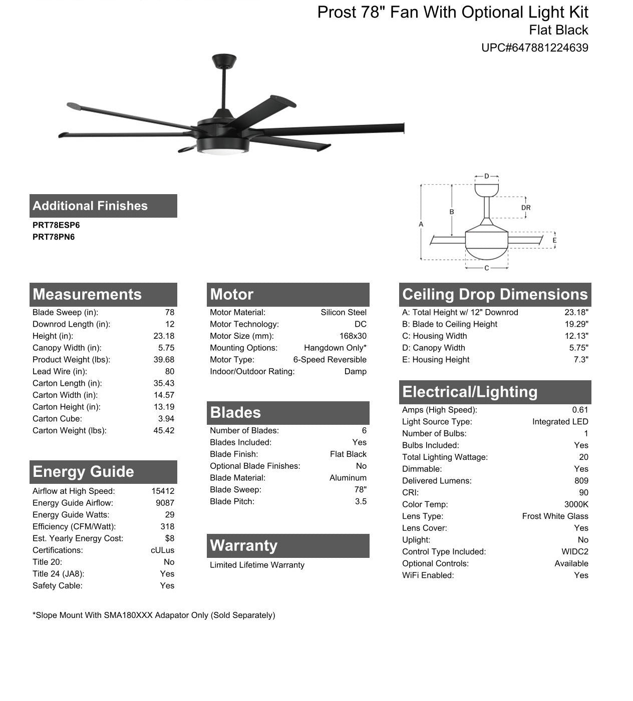 • Custom Prost 78" Aluminum Blades Included Flat Black