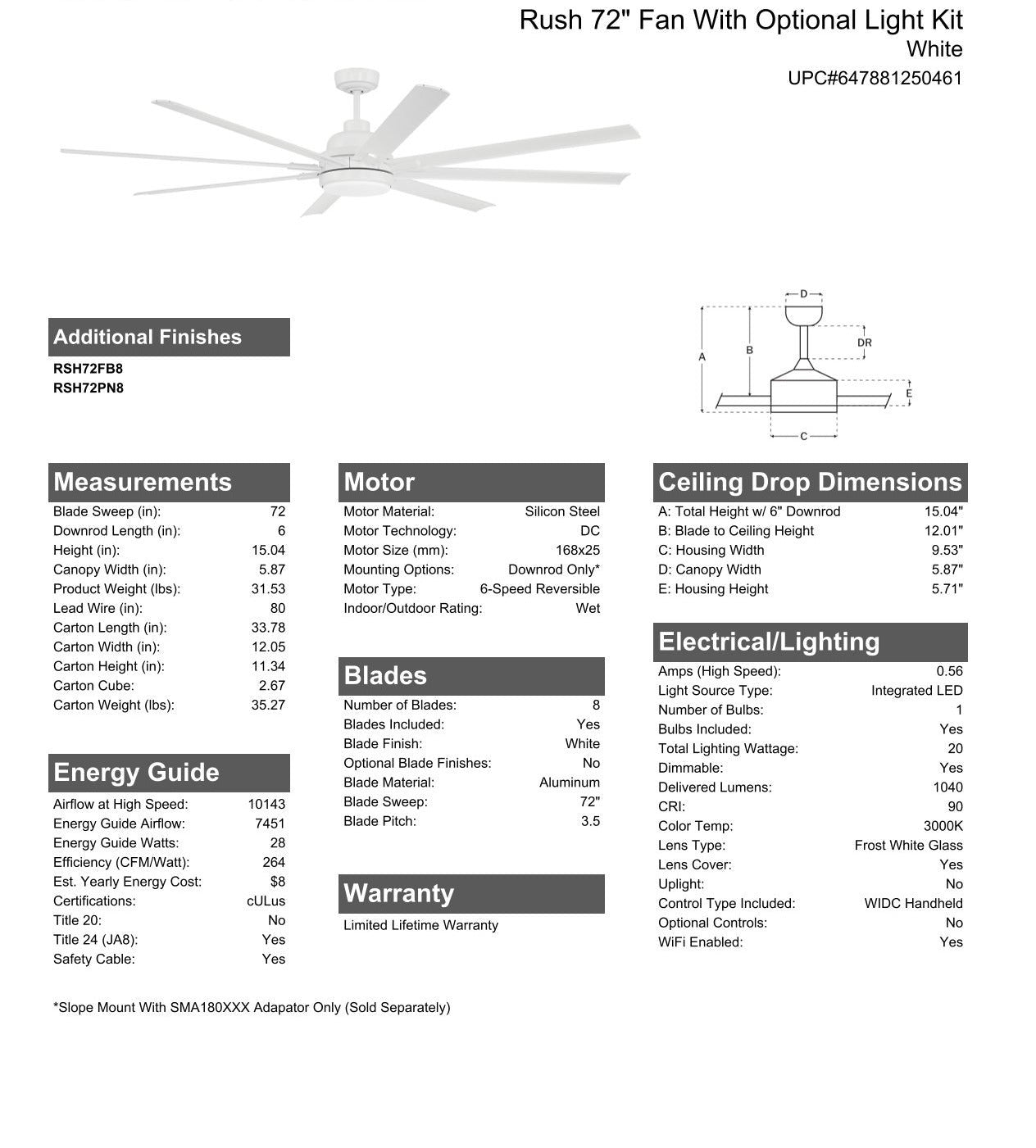 Designed to deliver maximum airflow, the wet-rated Craftmade Rush 72" ceiling fan with its eight custom aluminum blades features a quiet energy-saving 6-speed, reversible DC motor, integrated dimmable LED light with optional lens cover and is easily controlled with either the included remote control or the integrated Wi-Fi featuring breeze and timer functions compatible for use with most smart home devices, smart phones and systems with no additional hub needed.