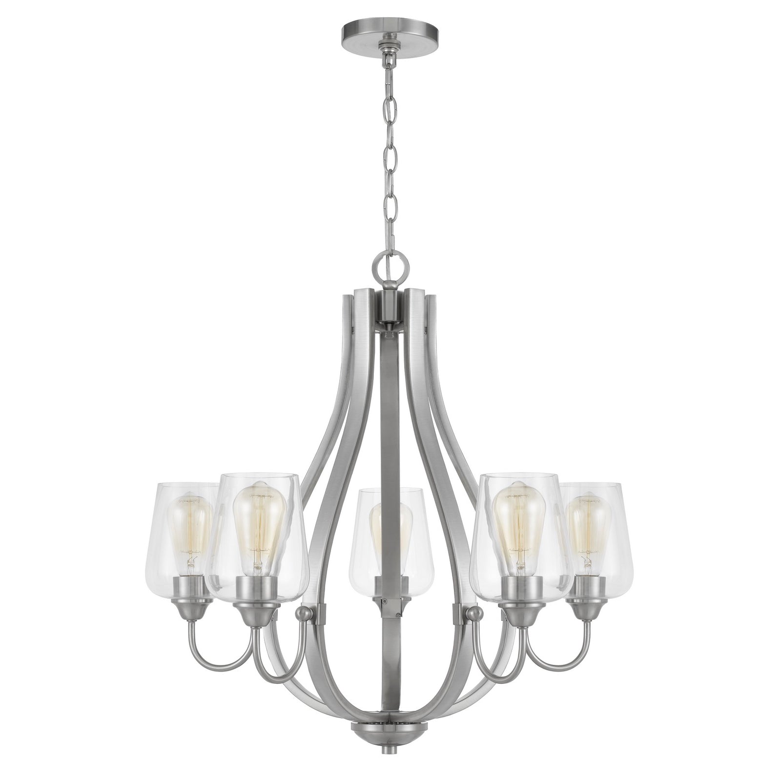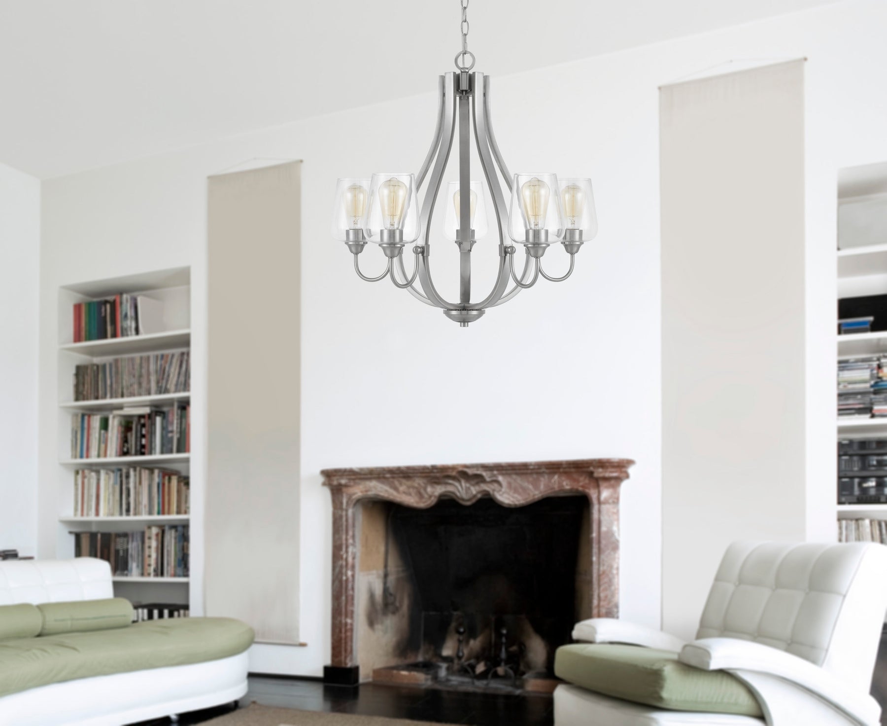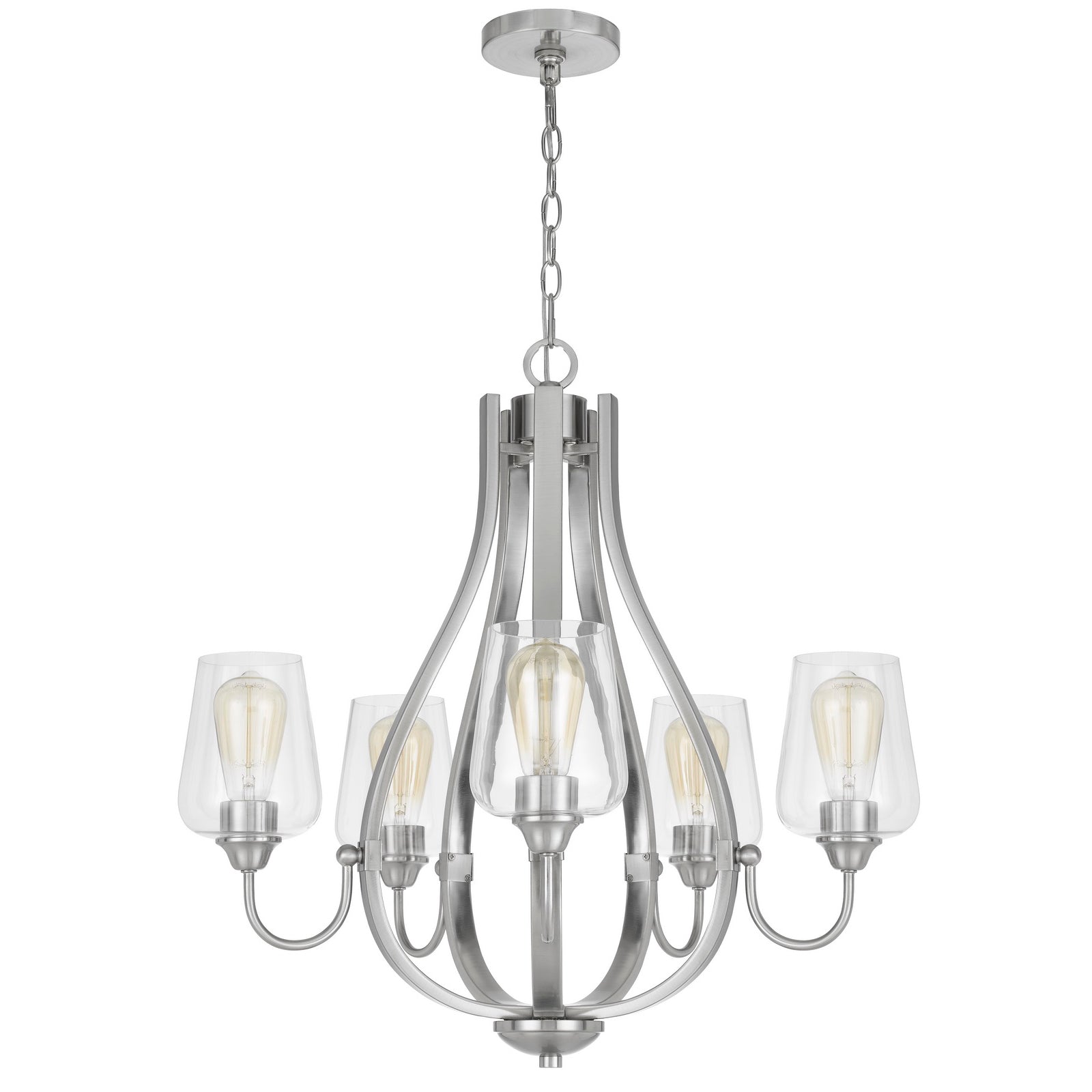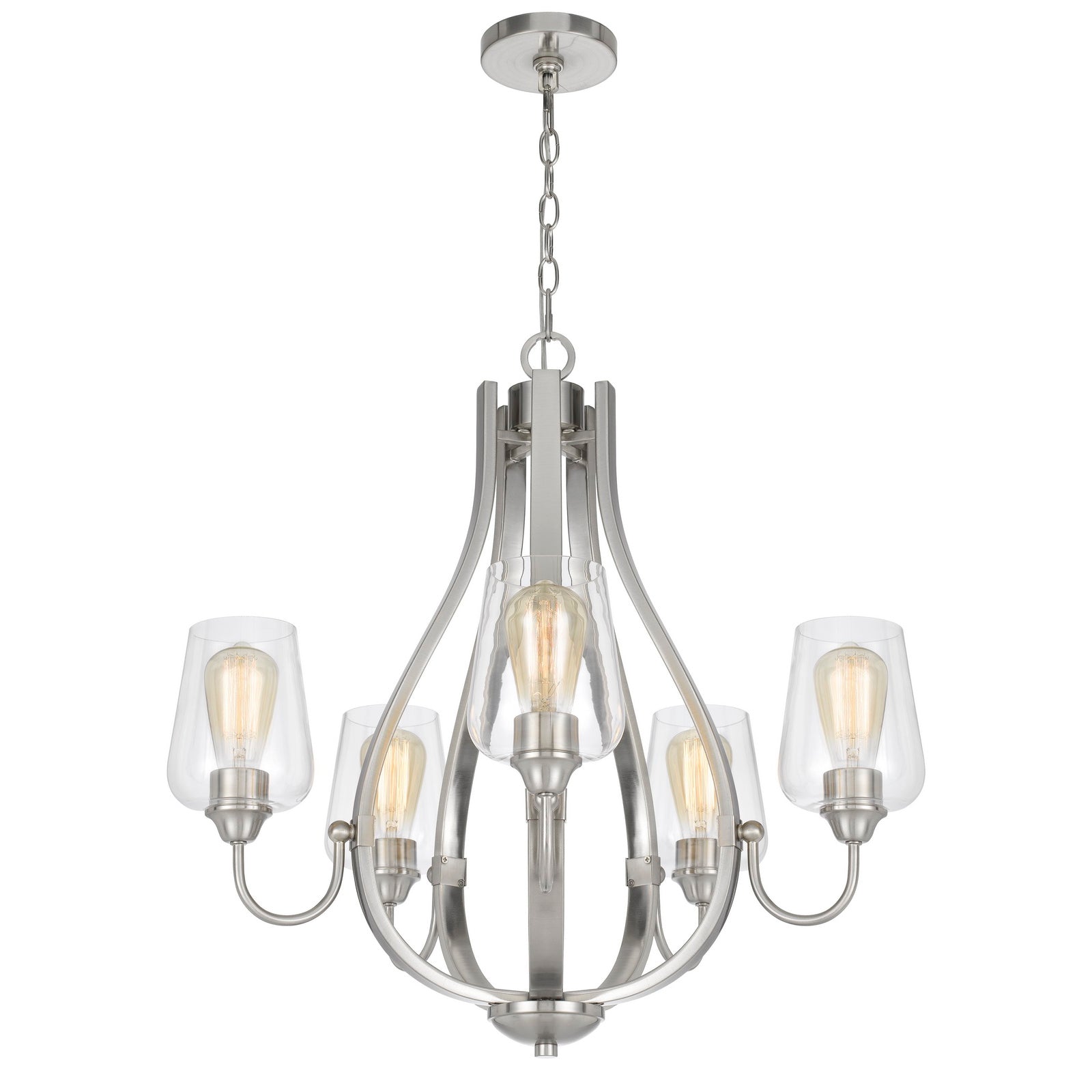 The Newport Metal Chandelier (Product No. FX-3773-5) blends contemporary style with practical features, making it a perfect addition to any modern space. This elegant fixture boasts a durable metal construction with a brushed steel finish, accommodating five 60W E26 bulbs (not included). Its tear drop style frame is complemented by clear white glass shades, enhancing the chandelier's upturned style. Included with the chandelier are 6 feet of chain and a matching canopy for easy installation. With a package dimension of 26.00\