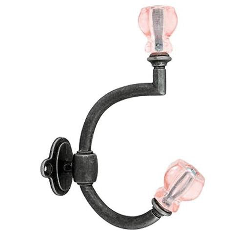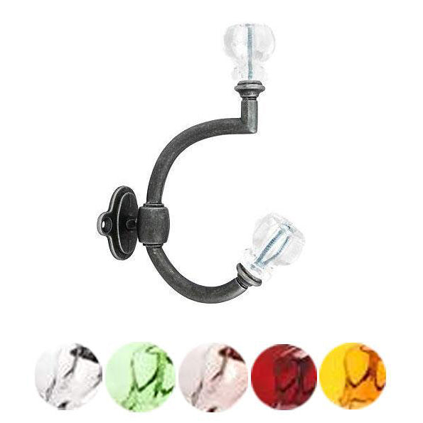 Measures 5 inches tall with a projection of 4 inches. Available in a vintage pewter finish. Available in several colors, including crystal clear, emerald green, depression pink, ruby red and amethyst. The average lead time for this hook is approximately 2 to 4 business days.