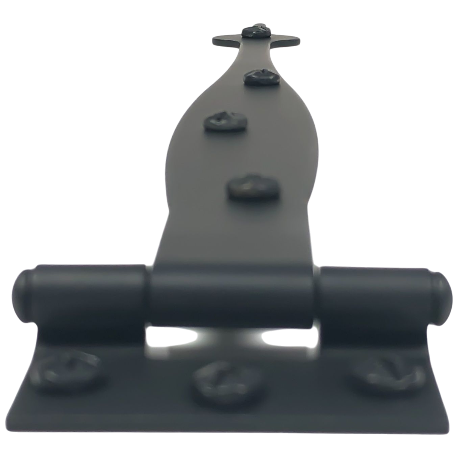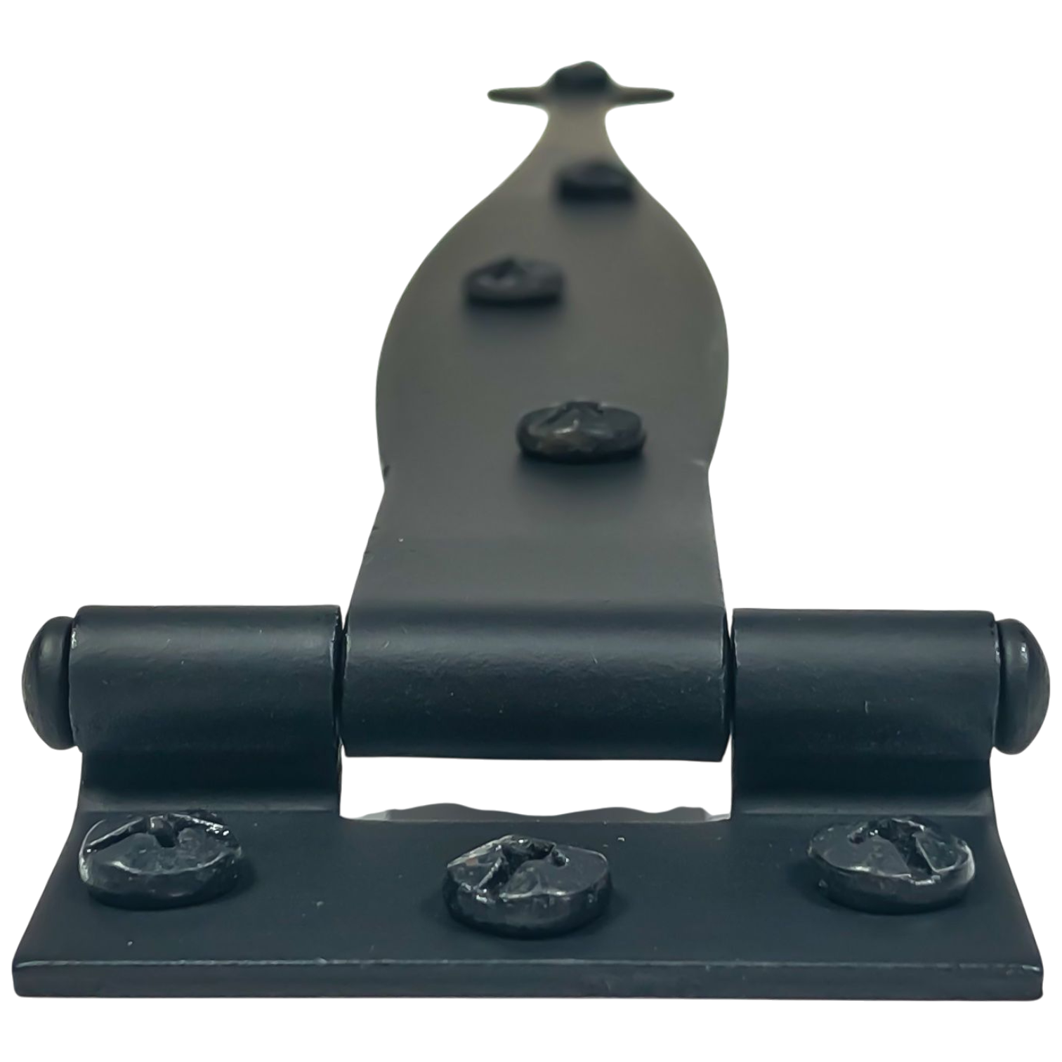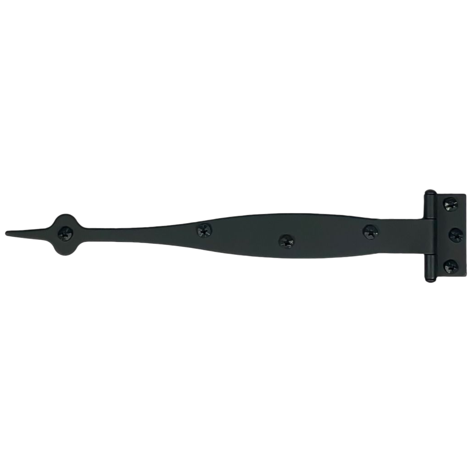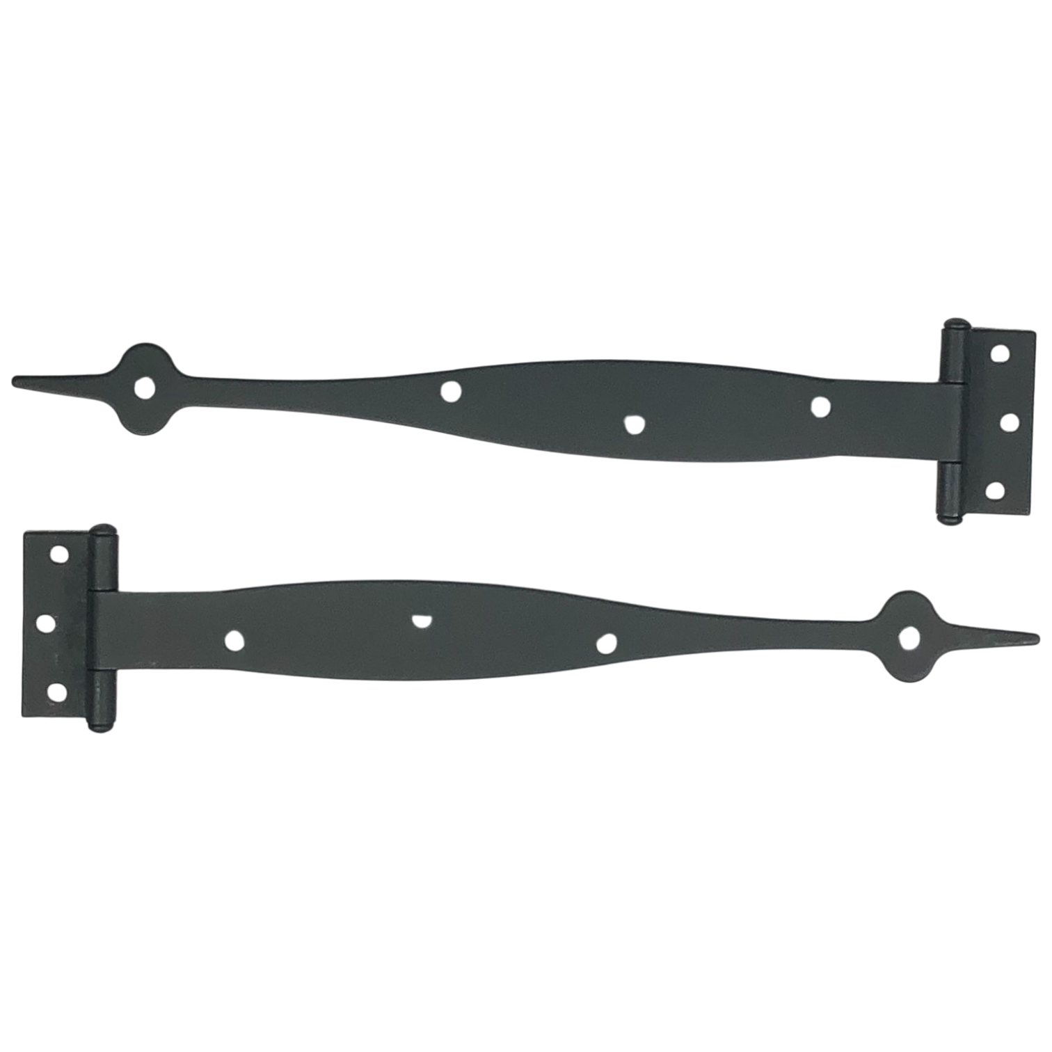 Solid cast iron strap hinge. Measures 9 inches long (228 mm) from the center of the hinge to the tip by 1 3/4 inches wide (44 mm) at the widest point - 3/8 Inch Offset. Comes complete with mounting hardware. The average lead time for this hinge set is approximately 3 to 5 business days.