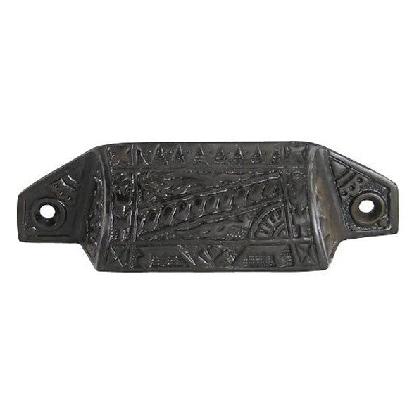 Measures 4 1/8 inches long and 1 1/8 inches tall. Center to center spacing measures 3 1/2 inches (88.9 mm 3.50 c-c). Hand cast and hand finished piece with highly ornate detailing. This product comes as an unlacquered natural brass and it will patina over time. A high strength lacquer coating is available upon request. Available in a variety of finishes including Polished Brass, Antique Brass, and Black Bronze.