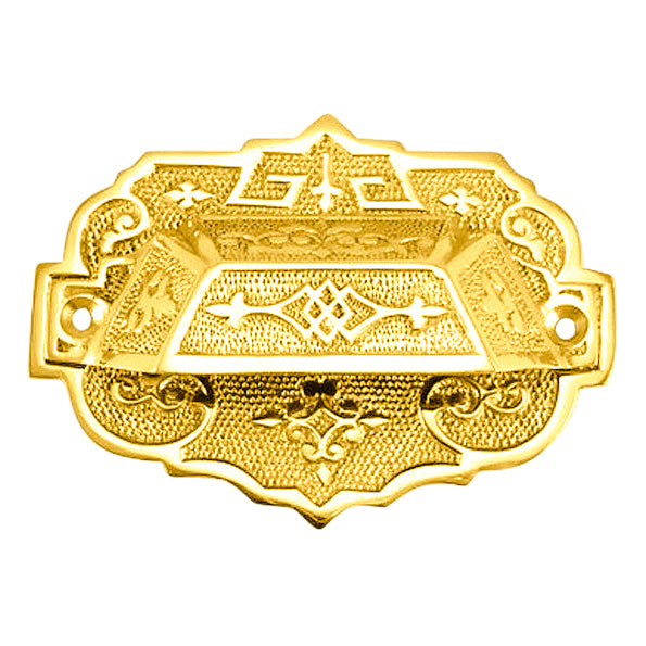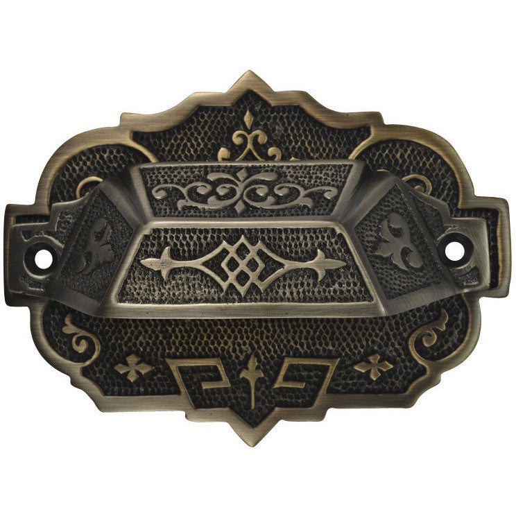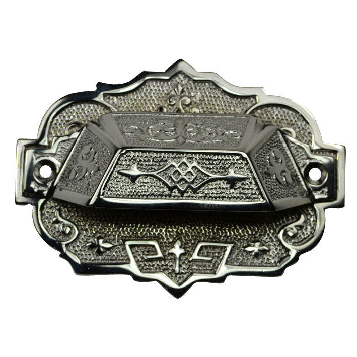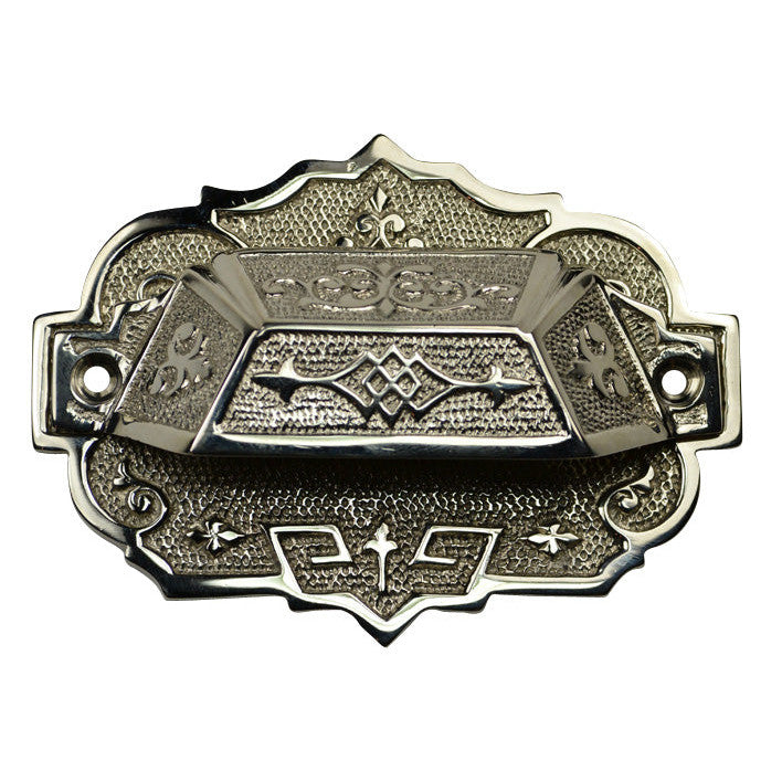 This sleek bin pull measures 4 inches long and 1 1/4 inches tall. Backplate measures 4 3/8 inches long and 3 1/4 inches tall (88.2 mm 3.25 c-c). Center to center mounting distance is 3 5/8 inches. Highly ornate and hand finished detailing.