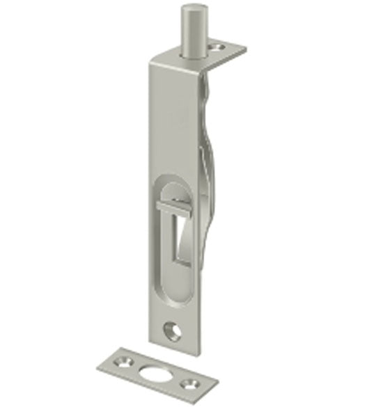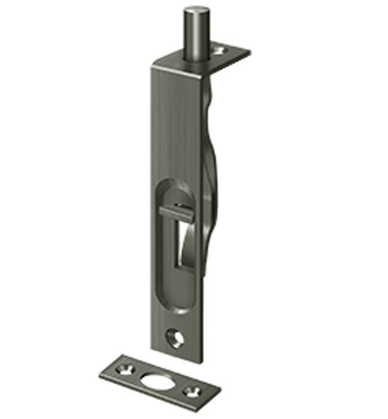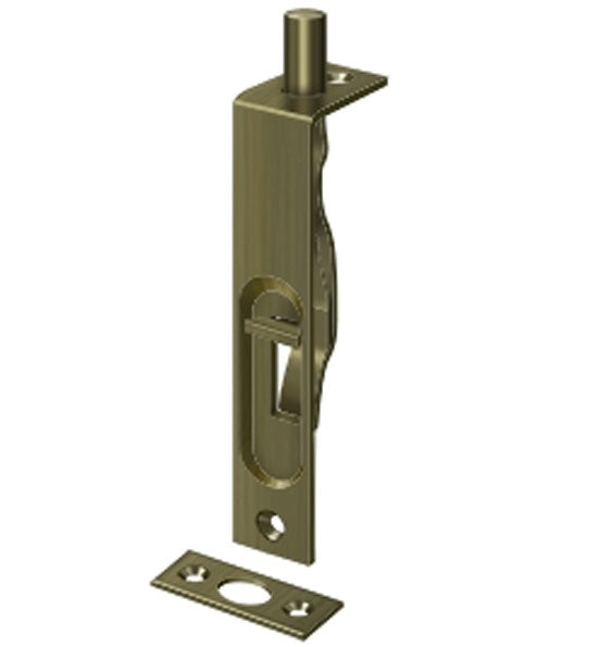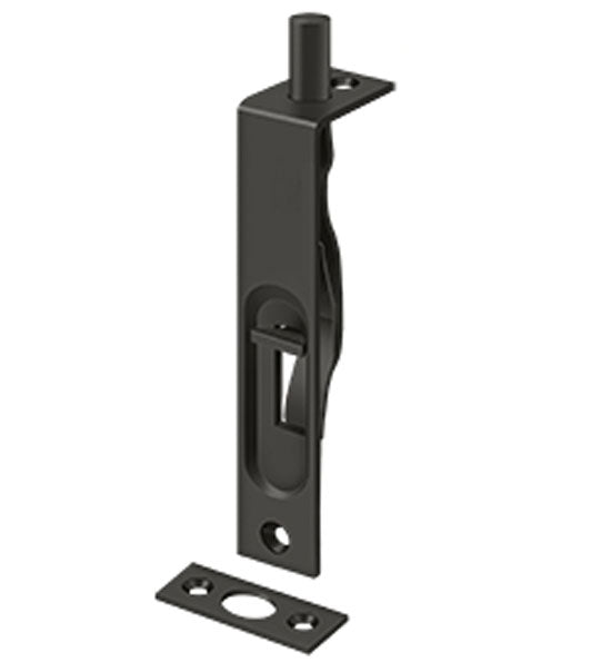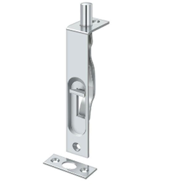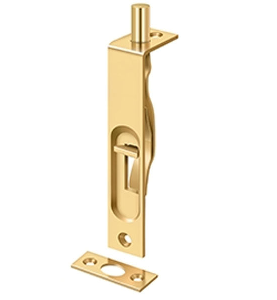 This Deltana flush bolt includes a solid brass construction and a fine polished brass finish. This item is a mortised assembly for a flush finish on any door. It is made from solid brass and it comes with a receiver plate and the associated hardware. This is available in several finishes including Polished Brass, Antique Brass, Lifetime Polished Brass, Oil Rubbed Bronze, Flat Black, Polished Chrome, Brushed Chrome, Brushed Nickel, and Antique Nickel. This Flush Bolt comes with the mounting hardware. The average lead time for this particular product is 3 to 5 Business Days.Â