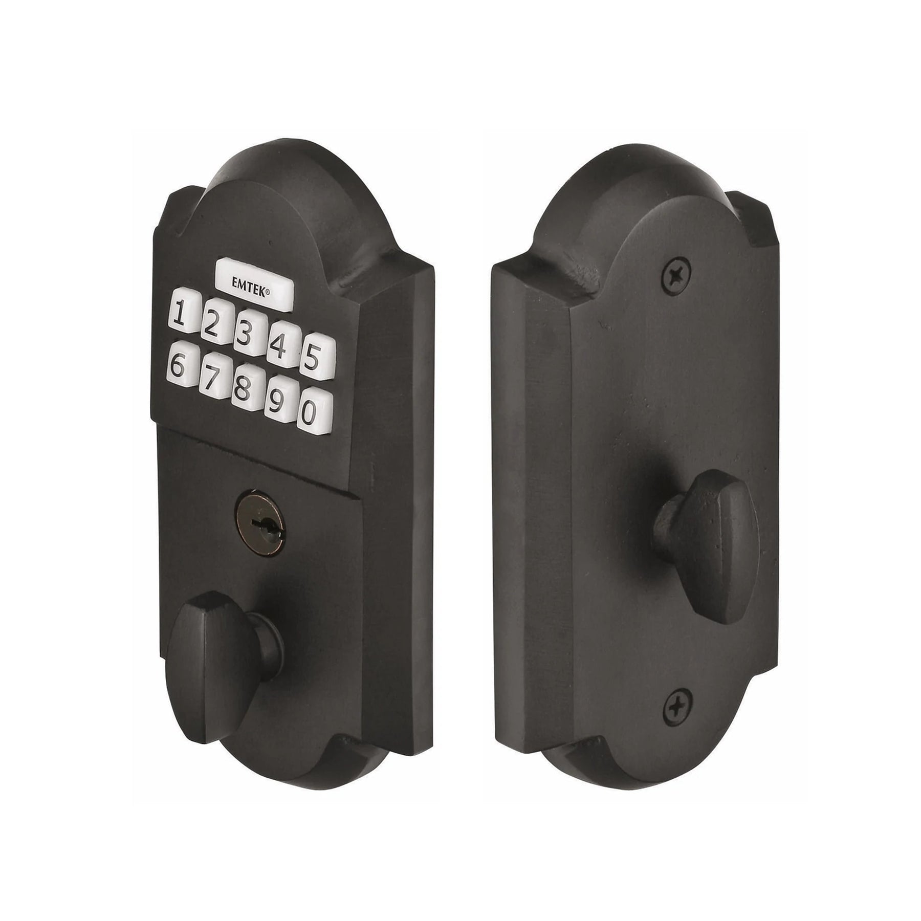 The EmTek keyless electronic deadbolt features a smooth flat black patina or medium bronze finish for a stylish look. Leave your keys behind with freedom and security that Emtek's keypad deadbolt provides. This electronic deadbolt fits any door between 1 3/4 inch and 2 1/4 inch thick with a 2 1/8 inch standard bore. Easy to use installation and programming instructions are provided. This deadbolt is factory programmed with 2 unique, secure user codes for use right out of the box, and can be programmed with up to 20 user codes of your choice. The codes can be added or deleted. Easy lock and unlock operation, enter the 4 digit code and turn the exterior thumb turn. Programming changes can be easily made using the keypad. Keypad has a protective coating to prevent wear patterns. The keypad is illuminated for quick operation after dark. This fantastic deadbolt even has a low battery indicator to let you know when it's time to change the battery. The average lead time for this particular product is 4 to 7 Business Days.