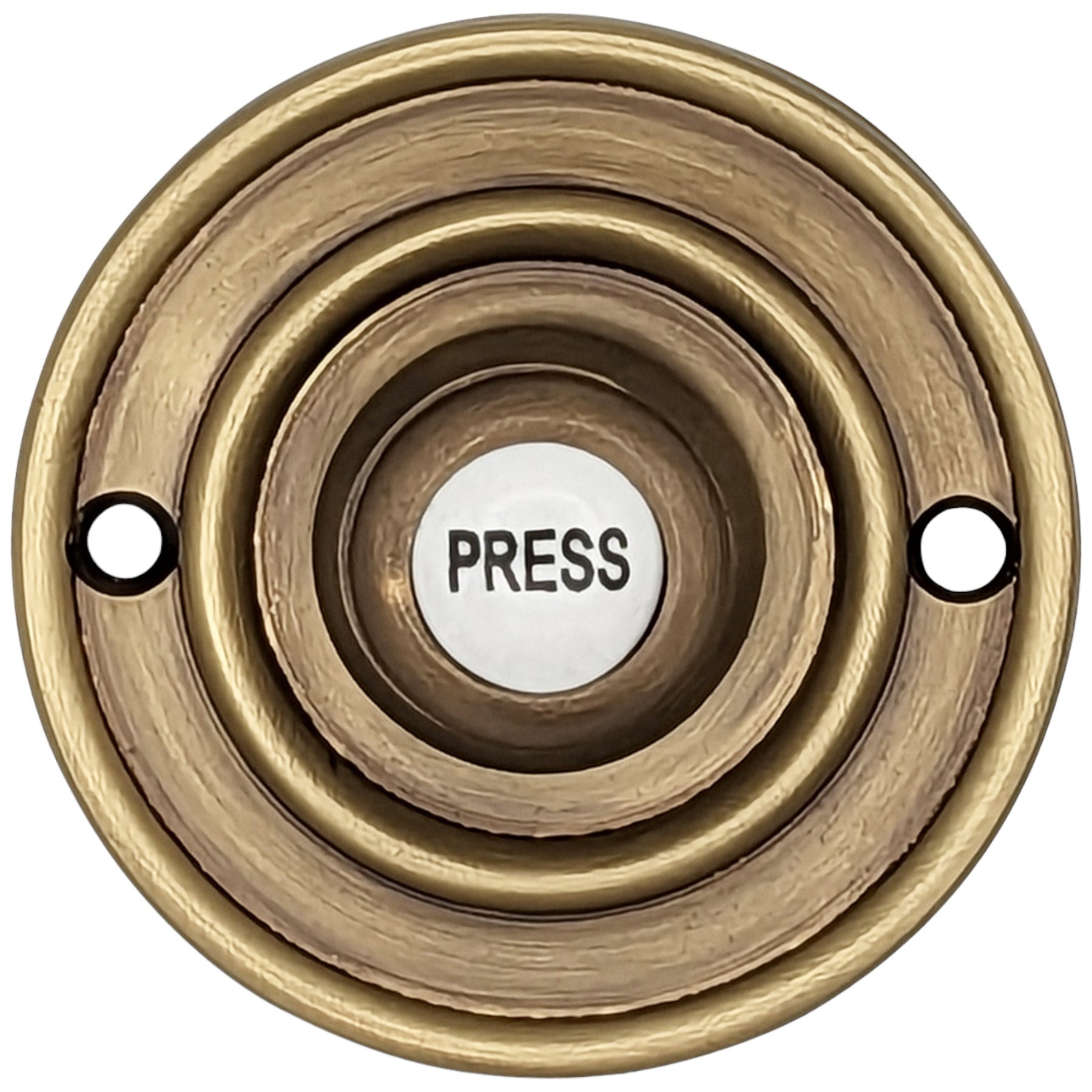 This doorbell button mounts with two brass screws (included). Measures 2 1/3 inches in diameter with a projection of 1/2 inch. Uses 24 volt maximum (standard doorbell circuits).