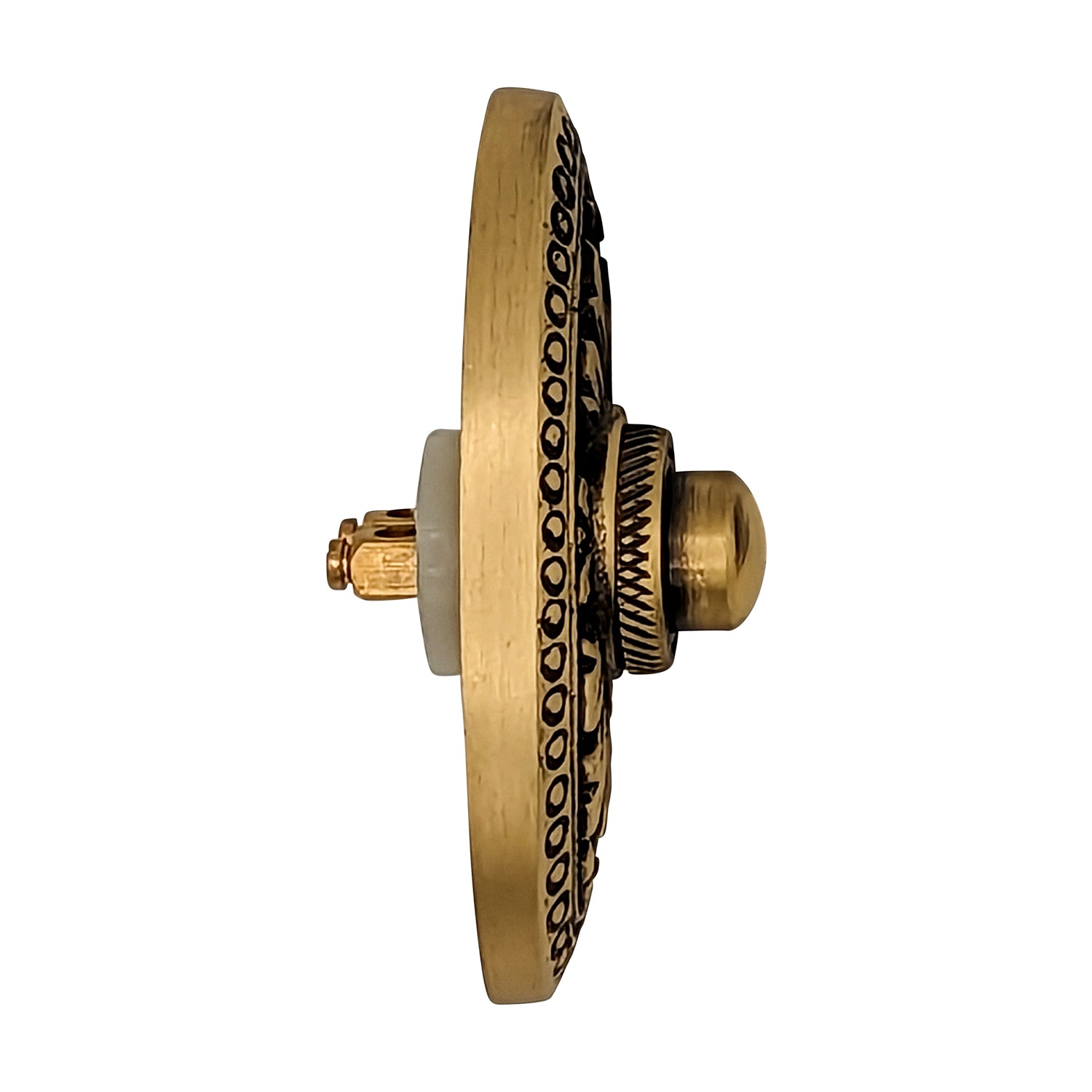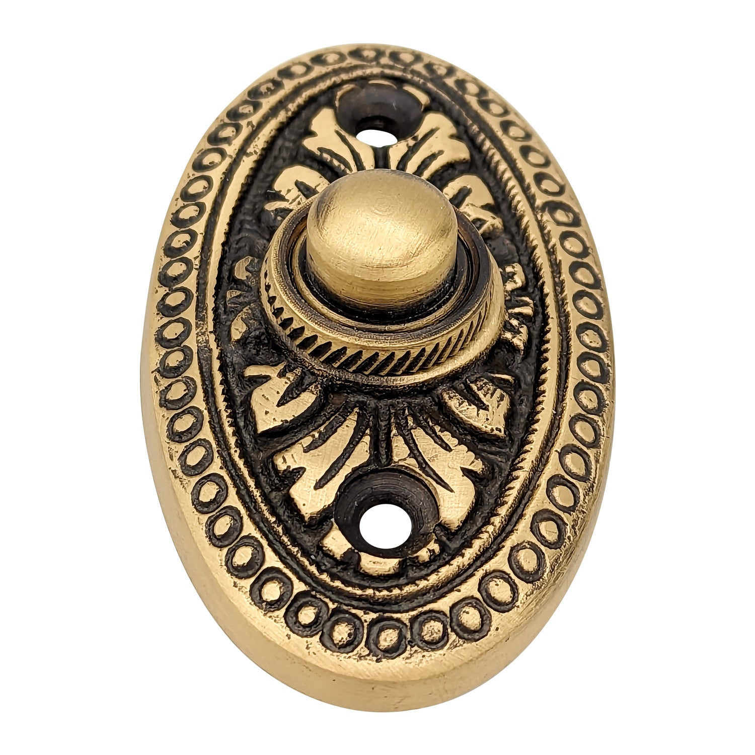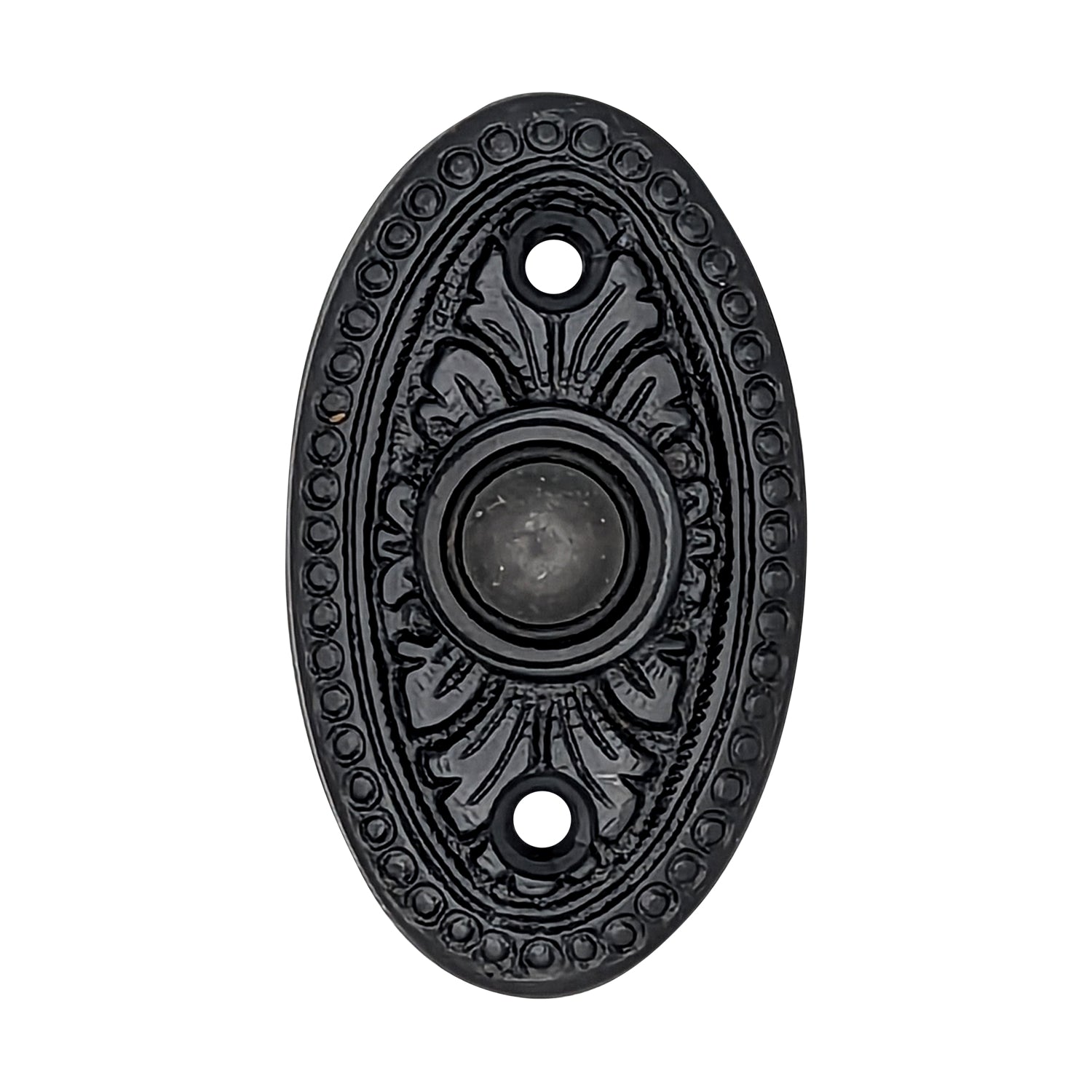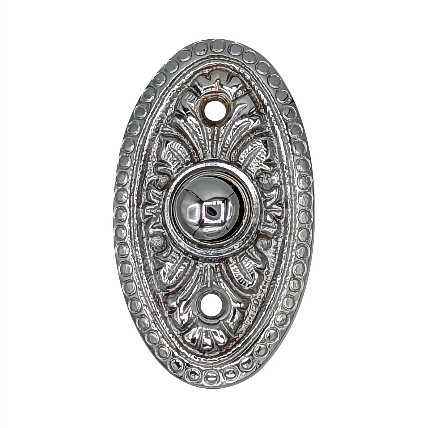 This doorbell measures 2 5/8 Inches by 1 1/2 Inches. Direct screw mount and connects on normal door bell voltage with two common wires. Uses 24 Volt maximum (standard doorbell circuits). Includes all necessary mounting hardware. The average lead time for this particular product is 3 to 4 Business Days.