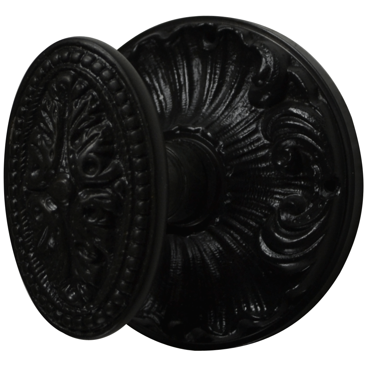 This intricately cast oval knob, featured in the P & F Corbin Catalog of 1923, a prominent American manufacturer of architectural hardware and locks during the late 19th and early 20th centuries, stands out particularly in Antique Brass and Black Bronze finishes, adding a dramatic flair to any setting.