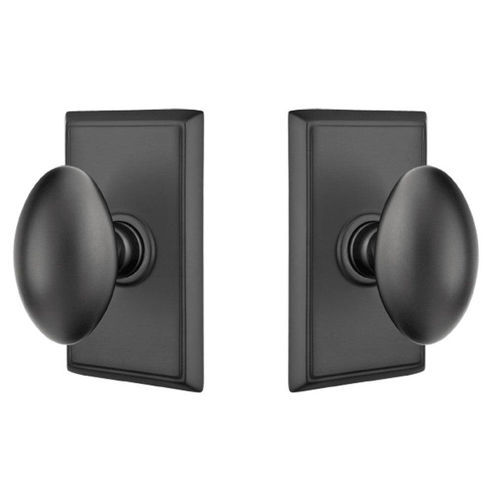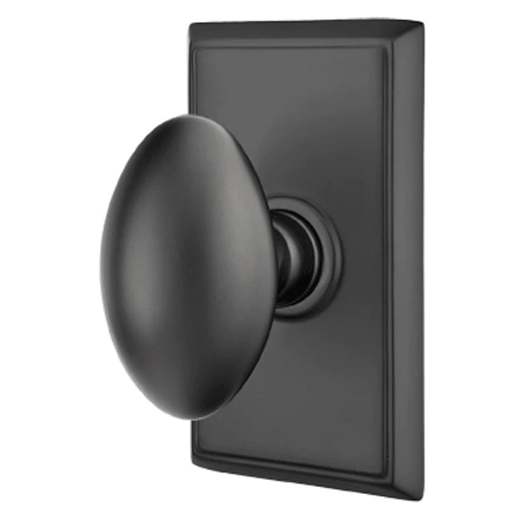Solid Brass Egg Door Knob Set With Rectangular Rosette - This door knob set comes in an egg style design and is constructed from solid brass material. Measures 2 1/2 inches overall with a 2 3/4 inch projection. Functional sets come complete with the functioning hardware and a 2 3/8 inch backset is standard. A 2 3/4 inch backset is also available upon request. This particular product has a lead time of approximately 3 to 5 business days.