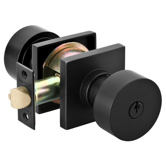 This round key in door lever from EmTek features a solid brass construction. The door knob measures 2 1/4 inches wide with a 2 3/4 inch projection. The square rosette measures 2 1/4 inches in length by 2 1/4 inches wide. Includes adjustable latch (2 3/8 inches and 2 3/4 inches backsets), strikeplate, two levers and two door rosettes. This set is made for modern doors and it fits any door thickness between 1 1/4 inch to 1 7/8 inches thick. Key-In knobs are larger than double dummy and non-locking knobs to accommodate the lock. Available in a variety of other finishes. This particular product has a lead time of approximately 3 to 5 business days.