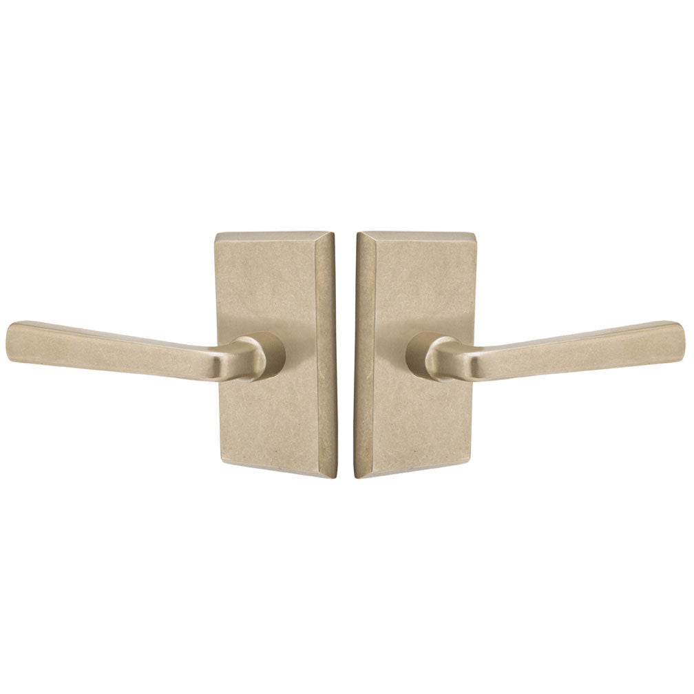 This lever door knob is constructed from solid brass and measures 4 7/8 inches overall with a 2 3/8 inch projection. Includes the two levers and door rosettes. Functional sets also include the lever latch, face plate and strike plate. This set is made for modern doors and it fits any door thickness between 1 3/8 inch to 2 1/4 inches thick. Functional sets come with a 2 3/8 inch back set latch - and a 2 3/4 inch back set may be requested at no additional charge. This door lever set comes complete with mounting hardware. Handing is required for leversets. The average lead time for this lever is approximately 3 to 5 business days.