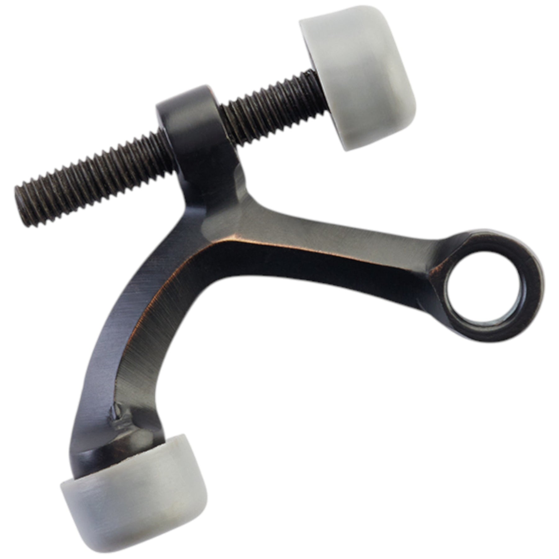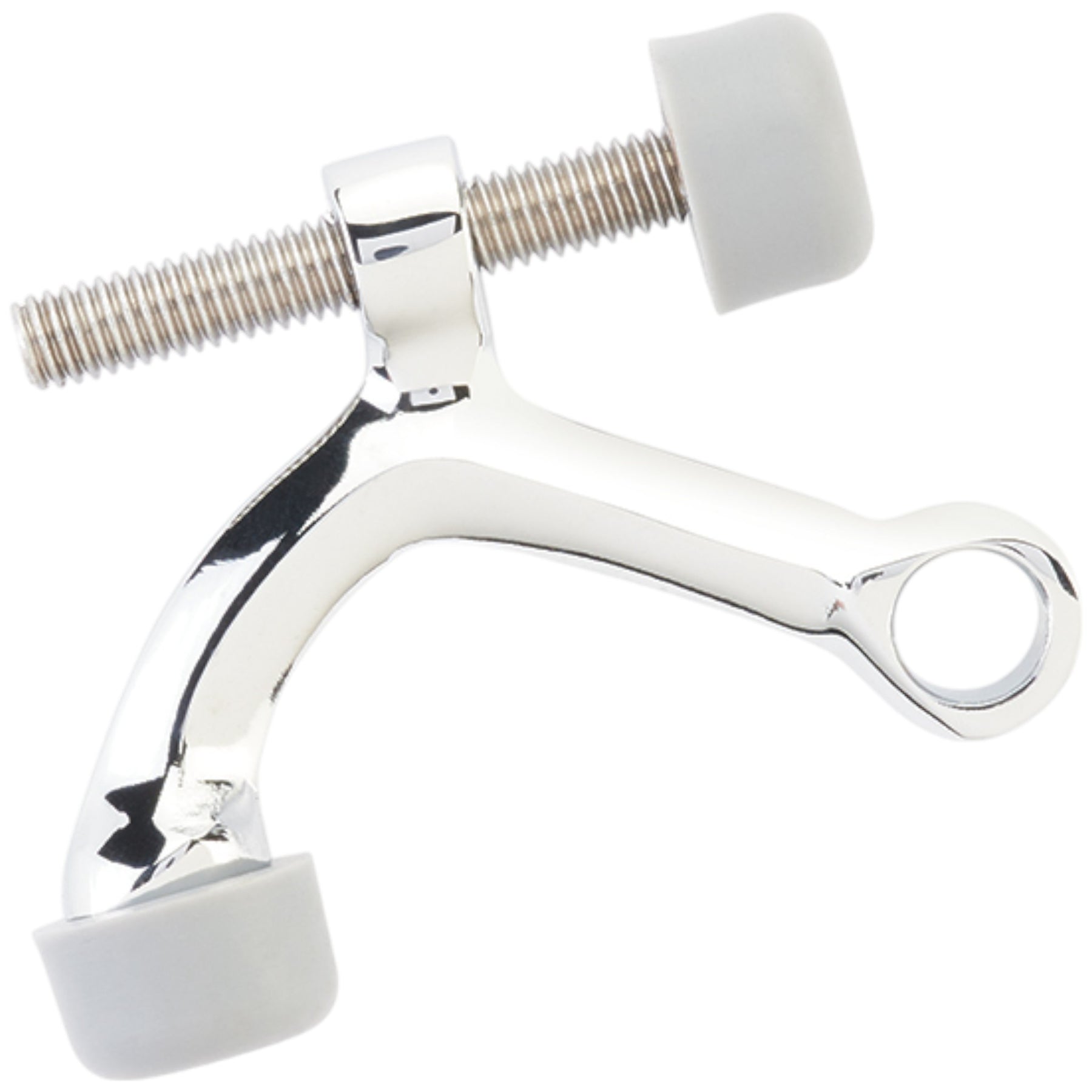 This hinge pin door stop is designed to prevent a door from swinging too far open, protecting walls and trim from damage. It features adjustable rubber-capped bumpers and installs easily onto the hinge pin for a secure fit.
