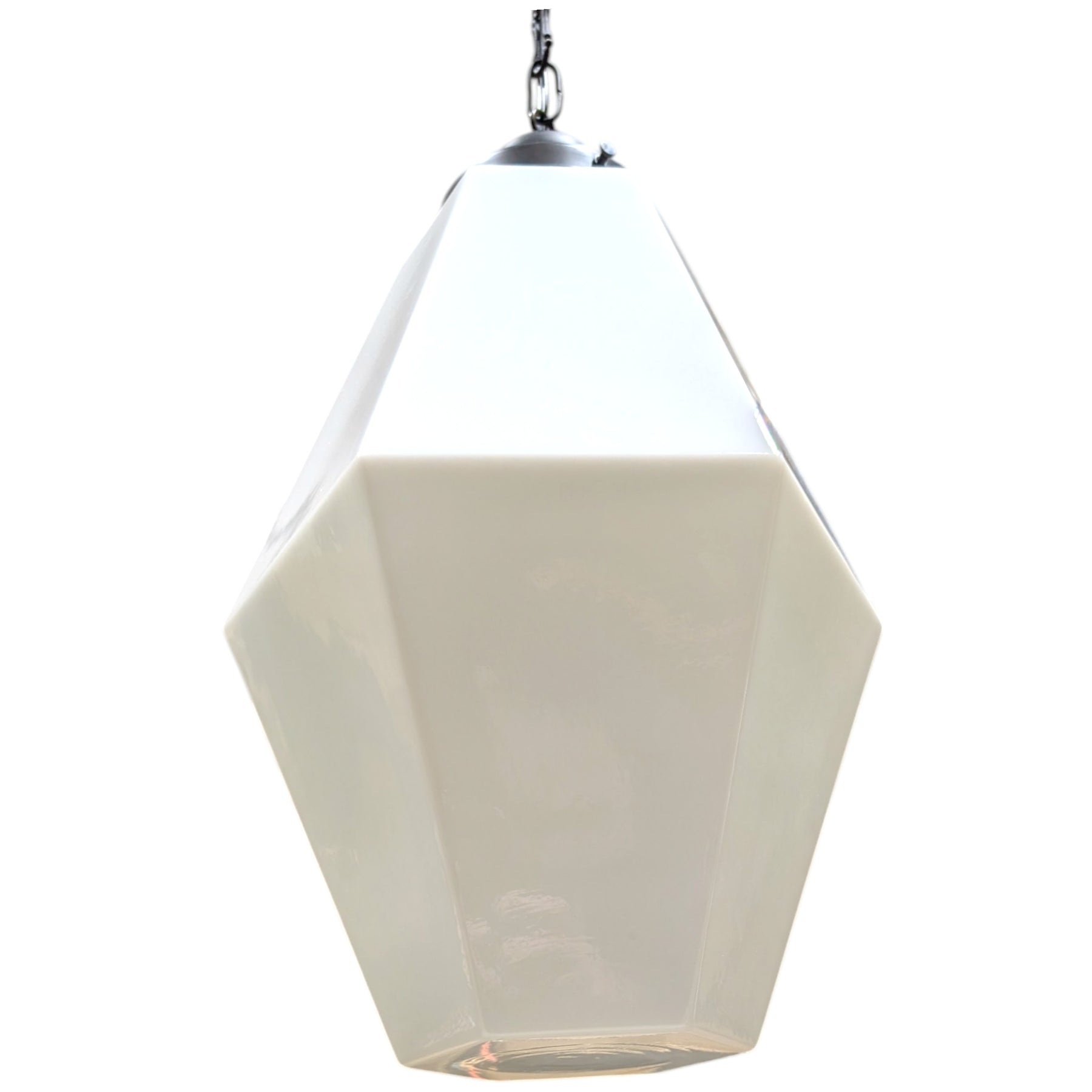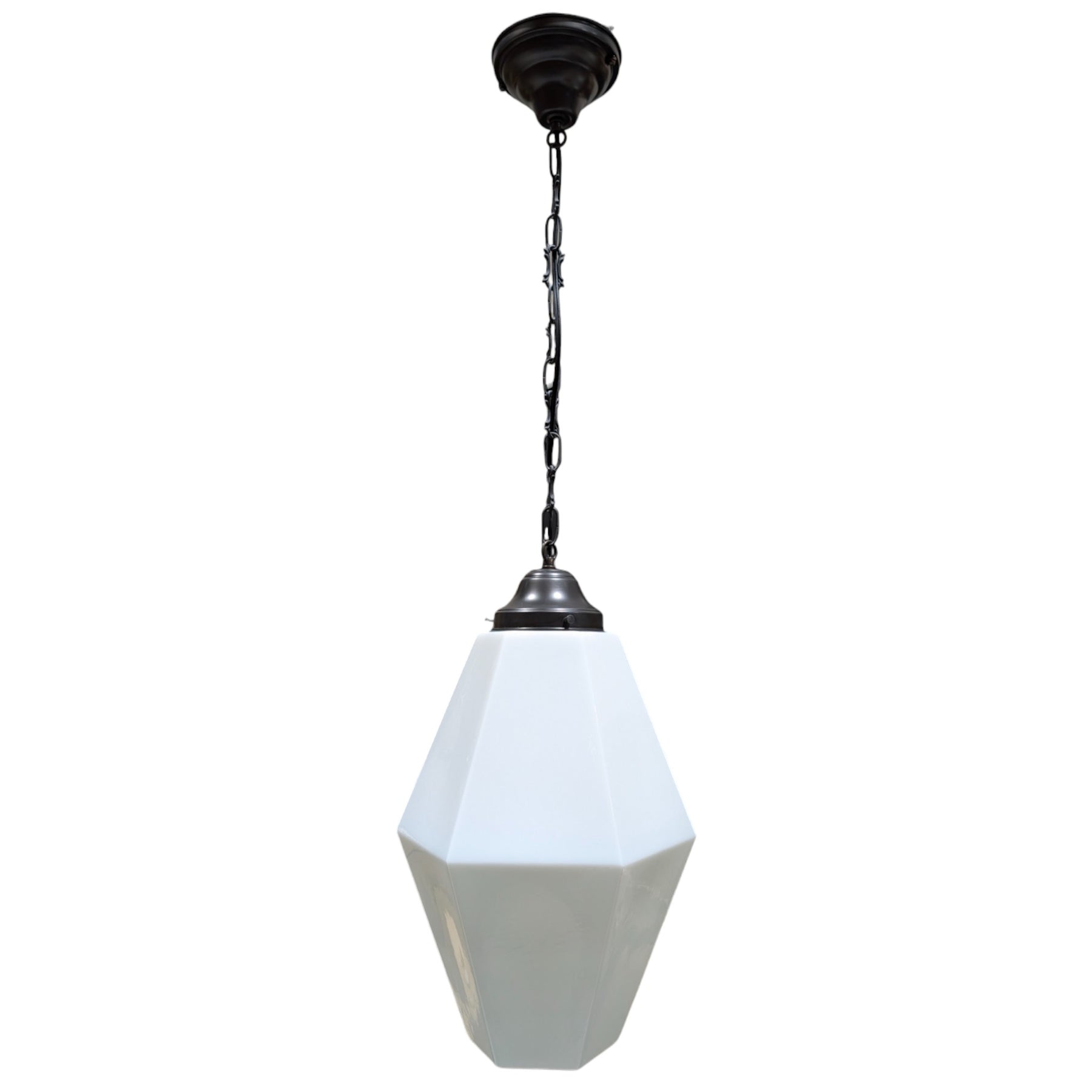 This striking geometric pendant light features a faceted opal glass shade, offering a bold yet elegant statement piece for any space. Its clean lines and timeless design make it a versatile choice, seamlessly complementing both vintage and modern interiors.