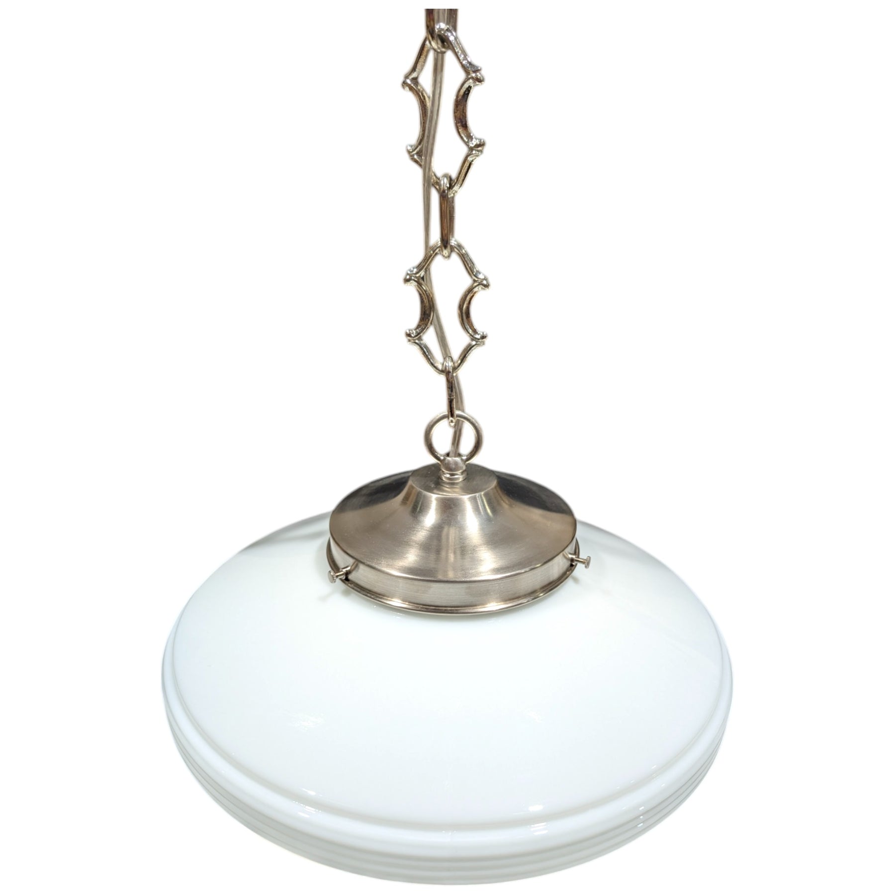 This vintage-inspired pendant light features a striking inverted opal glass shade, offering a bold yet timeless look. Its sleek geometric design makes it an ideal statement piece for kitchens, dining rooms, or entryways. Perfect for both classic and contemporary interiors, this fixture provides soft, diffused illumination with a touch of elegance.
