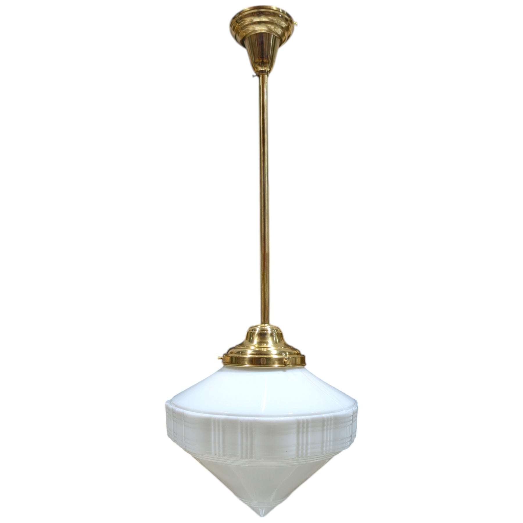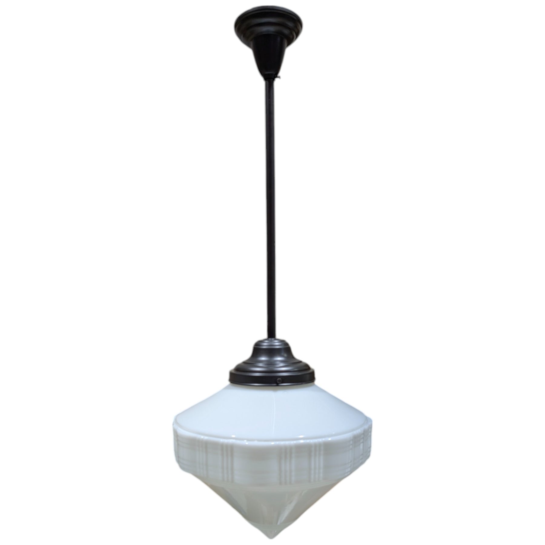 Featuring a striking diamond-shaped opal glass shade with subtle linear detailing, this fixture is a perfect blend of vintage charm and modern simplicity. The sturdy rod suspension enhances its sleek profile, making it ideal for dining areas, kitchens, or entryways. Inspired by mid-century design, this pendant light offers warm, ambient illumination while serving as a sophisticated focal point for your home, complementing both retro and contemporary interiors effortlessly.