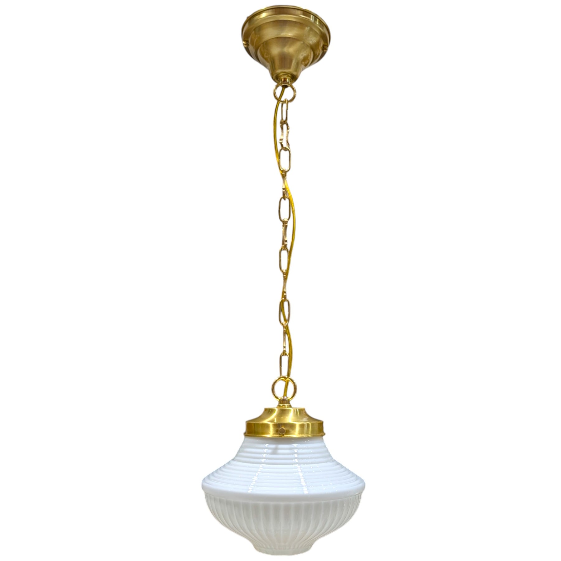 This elegant pendant light features a beautifully ribbed milk glass shade, offering a timeless blend of vintage charm and soft illumination. Its classic schoolhouse design makes it a perfect addition to kitchens, hallways, or dining spaces. With its versatile style, this fixture complements both traditional and transitional interiors effortlessly.