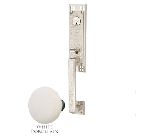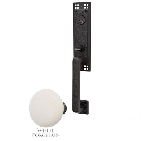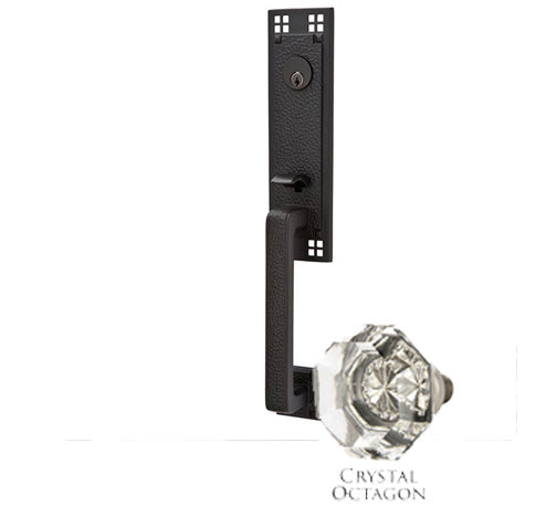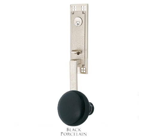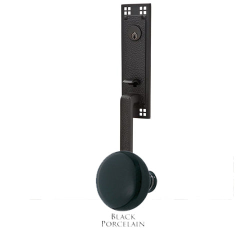This is a solid Brass standard Double Door Entryway set in an Arts and Crafts pattern. The finish is shown in a Rubbed Bronze and it is also available in Satin Nickel, Flat Black as well as Oil Rubbed Bronze. This is shown with the oval shaped hammered knob but it can also be paired with the crystal round knob, porcelain knob or several other optional knobs. This comes standard with a 2 3/8 inch back set and a 2 3/4 inch back set is also available. The deadbolt to knob center-to-center distance is 5 1/2 inches. For a mirrored look – the faux circular disk that matches the plate gives the illusion of symmetry is used on the double entryway sets. This particular product has a lead time of approximately 3 to 5 business days.