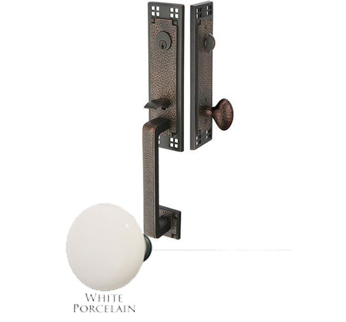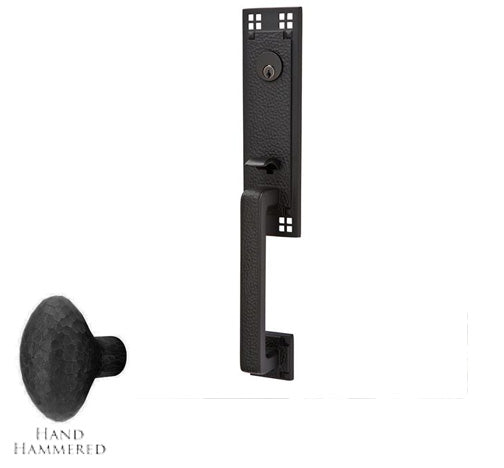 This is a solid Brass standard Entryway set in an Arts and Crafts pattern. Available in Rubbed Bronze, Flat Black, Satin Nickel. This is shown with the oval shaped hammered knob but it can also be paired with the crystal round knob, porcelain knob or several other optional knobs. This comes standard with a 2 3/8 inch back set and a 2 3/4 inch back set is also available. The deadbolt to knob center-to-center distance is 5 1/2 inches. This particular product has a lead time of approximately 3 to 5 business days.