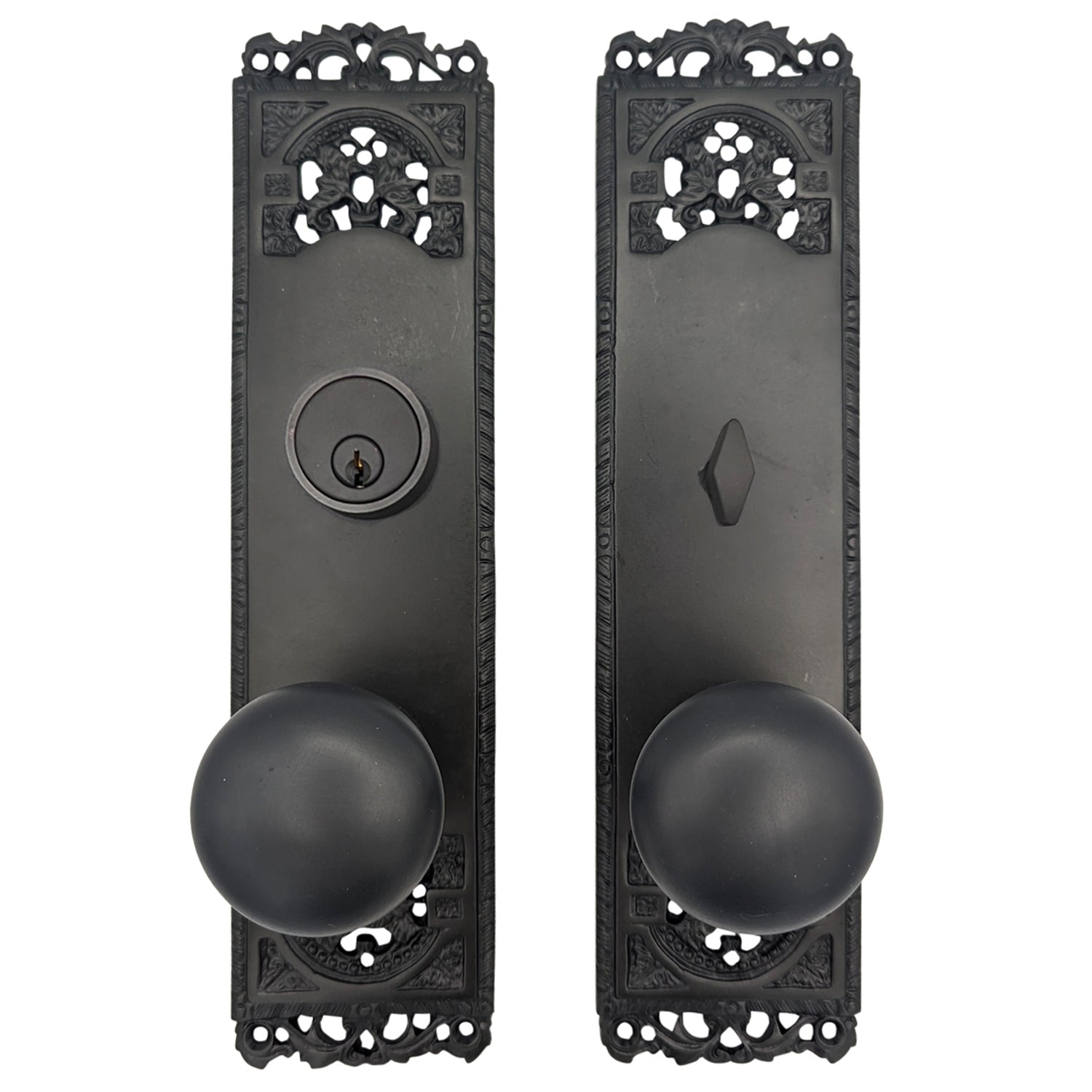 This entryway set is made from solid brass and measures 3 inches wide by 11 1/2 inches tall. Shown with the round brass knob. Other styles of knobs available at no additional charge. Entryway set deadbolt to knob center-to-center distance is 3 inches - other center-to-center distances are available upon request. Entryway backset comes as 2 3/8 inch standard and a 2 3/4 inch backset is available at no additional charge. This is a complete set and it comes with tubular latch mechanisms, strike plates, complete knob sets, internal mechanisms, deadbolts and all mounting hardware.
