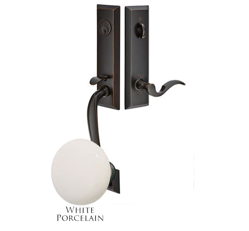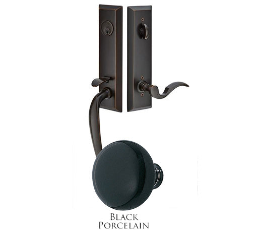 This entryway set measures 2 3/4 inch wide by 18 1/8 inch tall. Various styles of knobs available at no additional charge. Entryway set deadbolt to knob center-to-center distance is 5 1/2 inches. Entryway backset comes as 2 3/8 inch standard and a 2 3/4 inch backset is available if required. The overall grip thickness is 1 1/4 inch. The clearance between the door and grip is 2 inches. The plates have a thickness of 1/2 inch. This is a complete set and it comes with tubular latch mechanisms, strike plates, complete knob sets, internal mechanisms, deadbolts and all mounting hardware. This particular product has a lead time of approximately 3 to 5 business days.