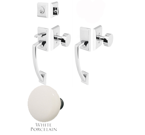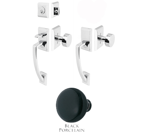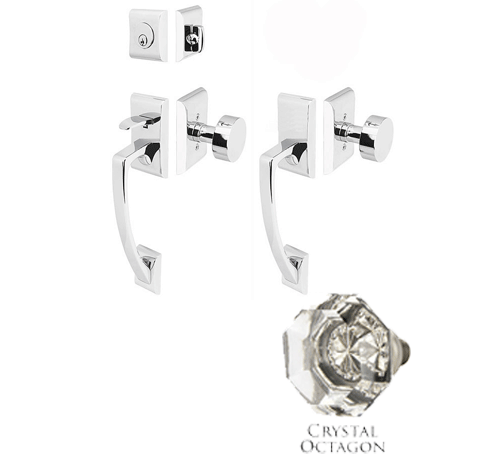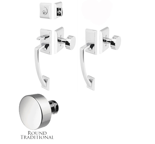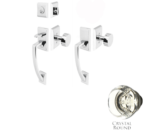 This entryway set measures 2 1/2 inch wide. The deadbolt plate measures 2 3/4 inches tall, and the door plate measures 4 5/8 inches tall. Comes in Polished Chrome finish. Various styles of knobs available at no additional charge. Entryway backset comes as 2 3/8 inch standard and a 2 3/4 inch backset is available if required. The overall grip thickness is 1 1/16 inches. The clearance between the door and grip is 1- 1 3/8 inches. The plates have a thickness of 7/16 inch. This is a complete set and it comes with tubular latch mechanisms, strike plates, complete knob sets, internal mechanisms, deadbolts and all mounting hardware. This particular product has a lead time of 3 to 5 business days.