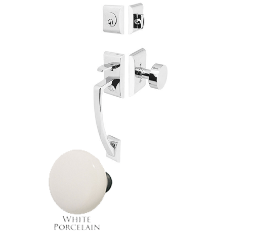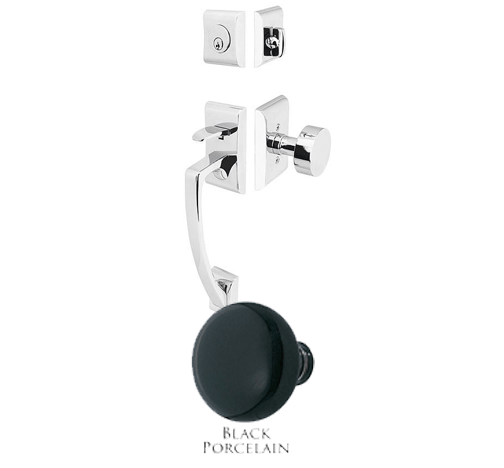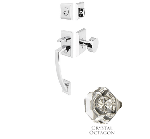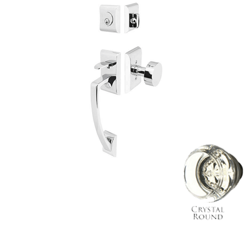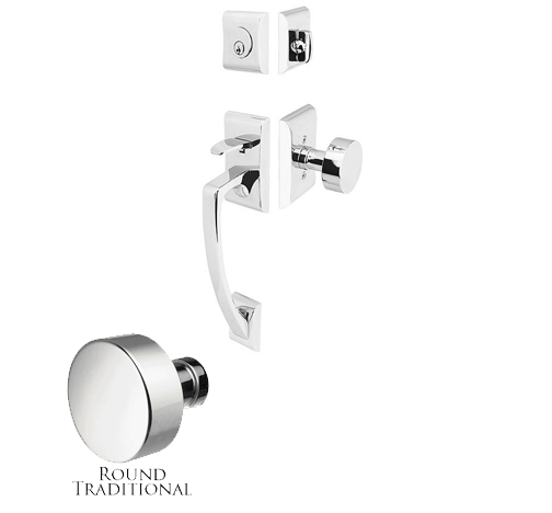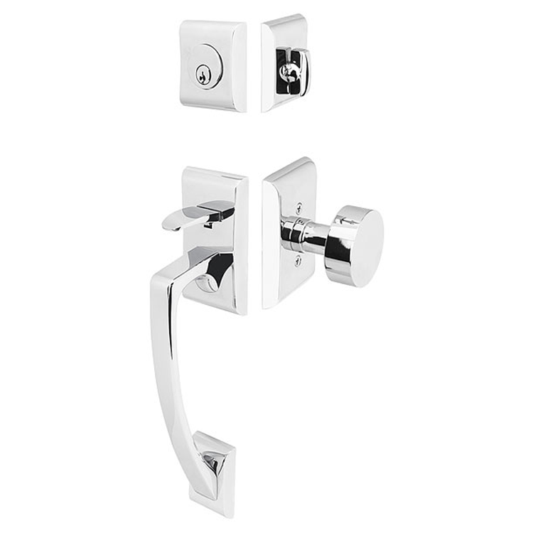 This entryway set measures 2 1/2 inch wide. The deadbolt plate measures 2 3/4 inches tall, and the door plate measures 4 5/8 inches tall. Comes in Polished Chrome finish. Various styles of knobs available at no additional charge. Entryway backset comes as 2 3/8 inch standard and a 2 3/4 inch backset is available if required. The overall grip thickness is 1 1/16 inch. The clearance between the door and grip is 1- 1 3/8 inches. The plates have a thickness of 7/16 inch. This is a complete set and it comes with tubular latch mechanisms, strike plates, complete knob sets, internal mechanisms, deadbolts and all mounting hardware. This particular product has a lead time of approximately 3 to 5 business days.