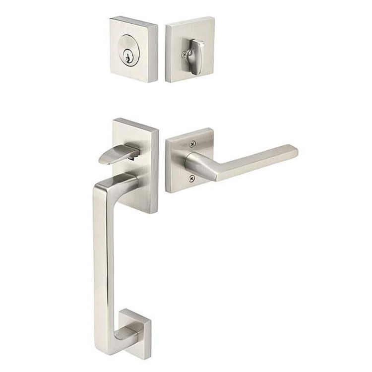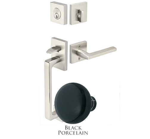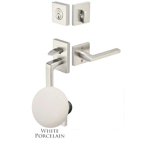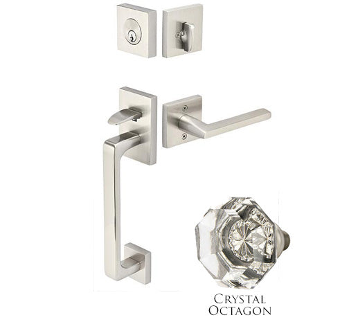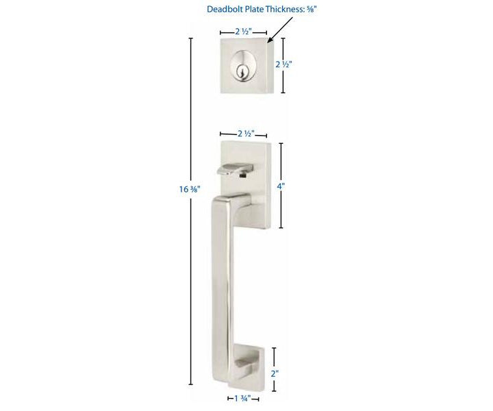 This entryway set measures 2 1/2 inch wide. The deadbolt plate measures 2 1/2 inches tall, and the door plate measures 4 inches tall. Various styles of knobs available at no additional charge. Entryway backset comes as 2 3/8 inch standard and a 2 3/4 inch backset is available if required. The overall grip thickness is 1 inch. The clearance between the door and grip is 1 7/8 inches. The plates have a thickness of 1/2 inch. This is a complete set and it comes with tubular latch mechanisms, strike plates, complete knob sets, internal mechanisms, deadbolts and all mounting hardware. This particular product has a lead time of approximately 3 to 5 business days.