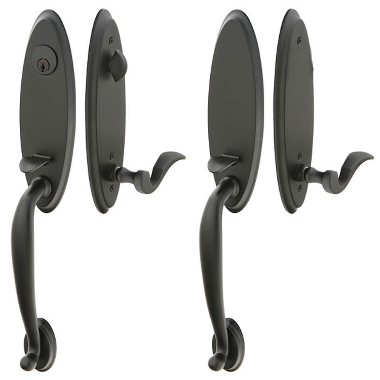 This entryway set measures 3 inch wide by 19 inch tall. Entryway set deadbolt to knob center-to-center distance is 5 1/2 inches. Entryway backset comes as 2 3/8 inch standard and a 2 3/4 inch backset is available if required. The overall grip thickness is 1 3/4 inch. The clearance between the door and grip is 2 inches. The plates have a thickness of 1/2 inch. For a mirrored look – the faux circular disk that matches the plate gives the illusion of symmetry is used on the double entryway sets. This is a complete set and it comes with tubular latch mechanisms, strike plates, complete knob sets, internal mechanisms, deadbolts and all mounting hardware. The average lead time for this entryway is approximately 3 to 5 business days.