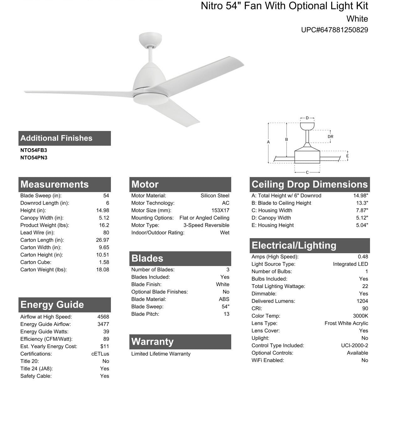 Indoor or Outdoors, the wet-rated Nitro 54" by Craftmade features custom ABS blades, an optional 22W dimmable LED Light with an optional lens cover, and a standard, 3-speed reversible motor with wall and remote controls to deliver airflow performance wrapped in sleek modern style.