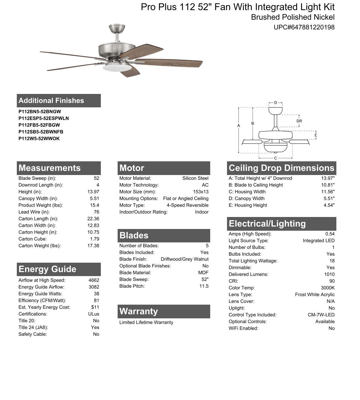 The ideal combination of excellent performance, exceptional value and timeless style, the Craftmade Pro Plus 52" ceiling fan with integrated dimmable LED light with wall control included featuring a clean motor, updated straight blade arms and canopy is built for performance. The dual mount, 3-speed, reversible fan includes custom 52" reversible blades.