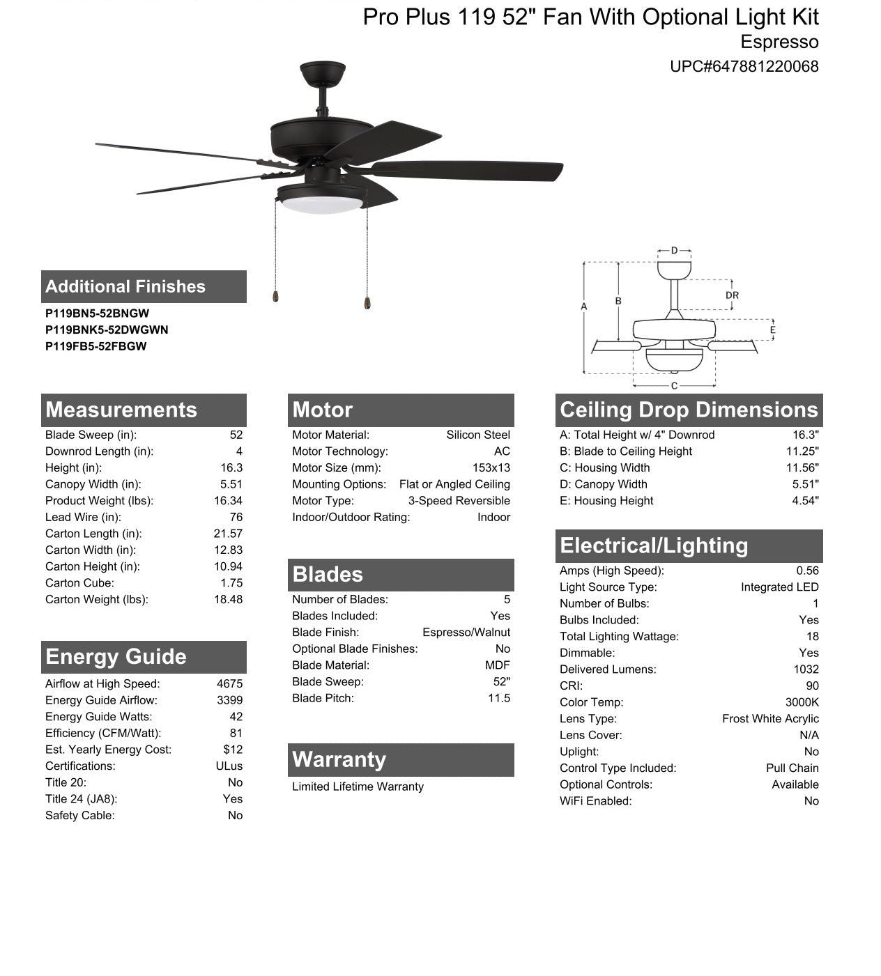 The ideal combination of excellent performance, exceptional value and timeless style, the Craftmade Pro Plus 52" ceiling fan with integrated frost white dimmable LED pan light included featuring a clean motor, updated straight blade arms and canopy is built for performance. The dual mount, 3-speed, reversible fan includes custom 52" reversible blades. Optional remote controls are available(Sold Separately).