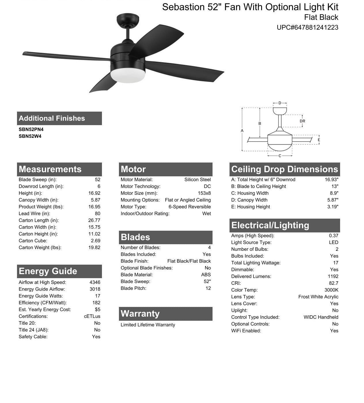 Excellent performance and timeless style combine in the 52" Sebastion smart ceiling fan from Craftmade. Wet rated for indoor or outdoor use, the 52" Sebastion features a quiet energy saving 6-speed, reversible DC motor, custom blades, integrated dimmable LED light with optional lens cover included and is easily controlled with either the included remote controls or the integrated Wi-Fi featuring breeze and timer functions compatible for use with most smart home devices, smart phones and systems with no additional hub needed.