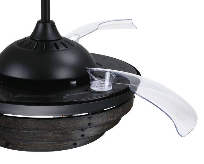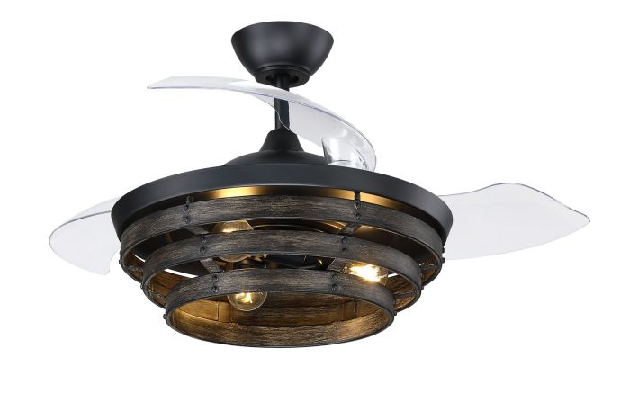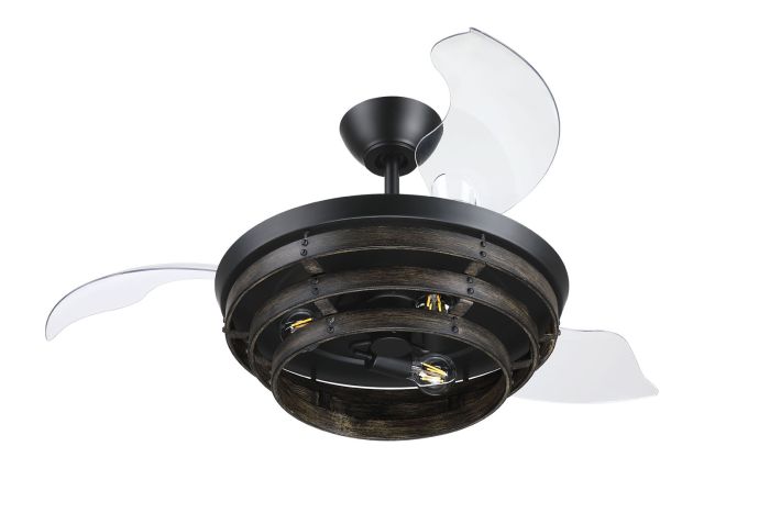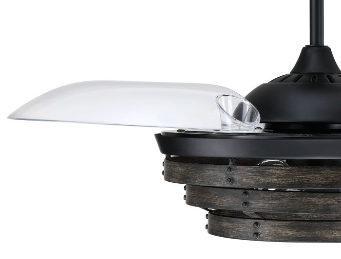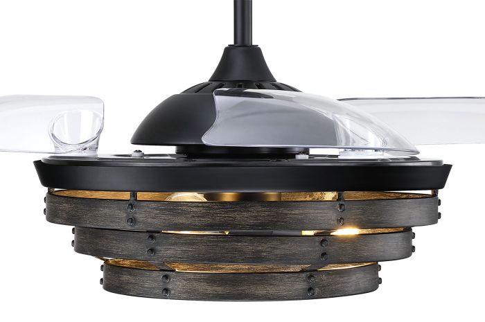 Featuring driftwood-finished bands with a flat black frame and rivet details that surround an integrated 3-light kit with dimmable LED bulbs included and hidden, retractable clear polycarbonate custom blades, the Whiskey 42" ceiling fan combines the best features of lighting and fans. Easily controlled with either the included remote control or the integrated WIFI feature that is compatible for use with most smart home devices, smart phones and systems, the Whiskey delivers both convenience and performance.