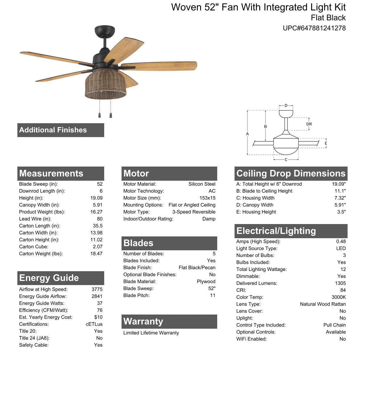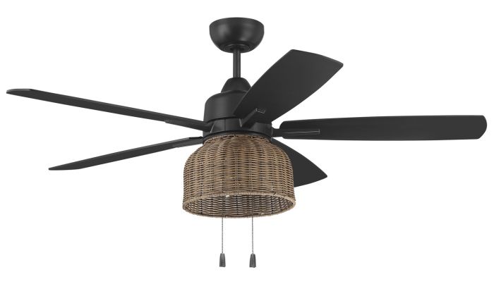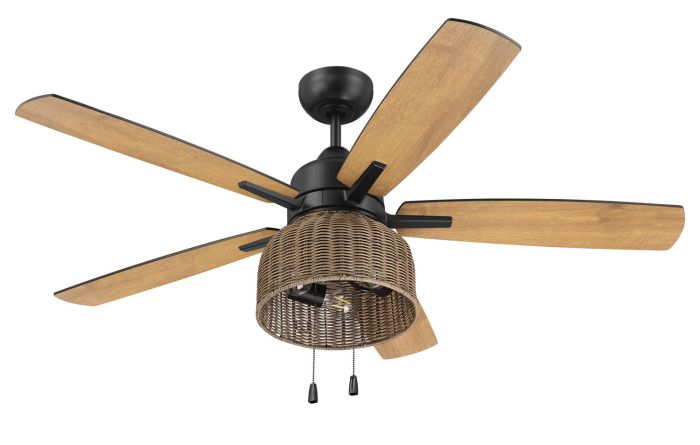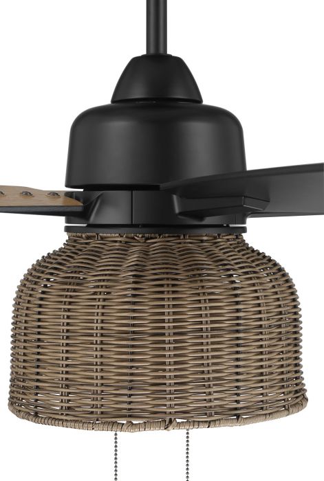 Damp rated for both indoor and outdoor installation, the Craftmade 52" Woven ceiling fan features a unique woven rattan 3 Light dome with LED bulbs included and reversible pecan/flat black blades that combine to create a oasis of natural beauty to enhance any space with style and performance delivered by a quiet standard, 3 speed reversible motor. Optional remote and wall controls sold separately.