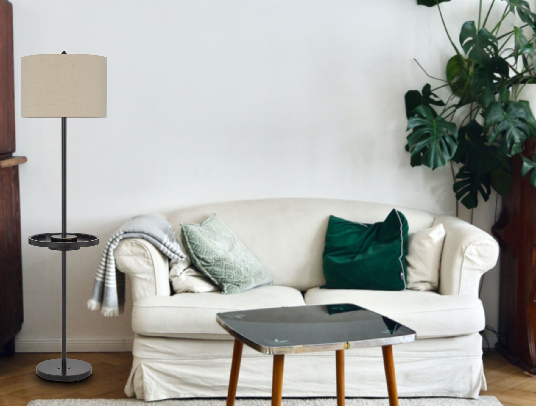 The Crofton Metal Floor Lamp (Product No. BO-2983FL-DB) is a perfect blend of functionality and modern design, featuring a durable metal construction and a slim pole style frame. This lamp includes a convenient 13.75-inch diameter tray table and two USB charging ports, providing accessibility for your devices. The hardback linen shade softens the light, while the weighted base ensures stability. With a maximum wattage of 150W and a versatile 3-way switch, this lamp is ideal for illuminating various spaces. Easy to assemble, it comes with a one-year warranty, making it a reliable addition to your home decor.