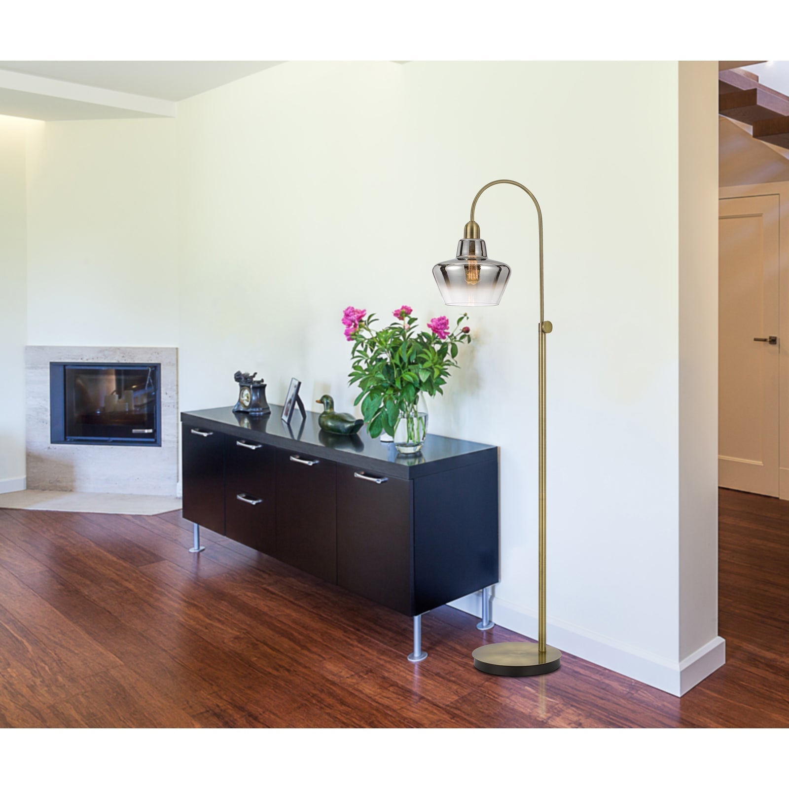 ##Antique Hardware## 40W DUXBURY METAL ARC FLOOR LAMP WITH ELECTORAL PLATED SMOKED GLASS SHADE