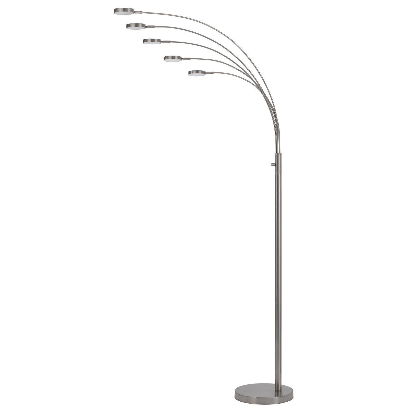 The Malibu Integrated LED 8W x 5 Metal Arc Floor Lamp (Product No. BO-3121FL-5L-BS) is a striking modern lighting solution that enhances the appearance of any room. Featuring a durable metal construction and a weighted base for added stability, this lamp is designed to last. It includes five integrated LED puck lights, each emitting 560 lumens with a warm 3000K light temperature, ensuring a bright and inviting ambiance. With a three-way switch type for versatile lighting options and requiring some assembly, this lamp is both functional and stylish. It ships in approximately 3 business days and comes with a one-year warranty to guarantee its quality.