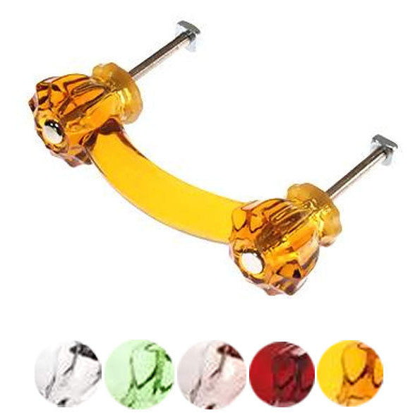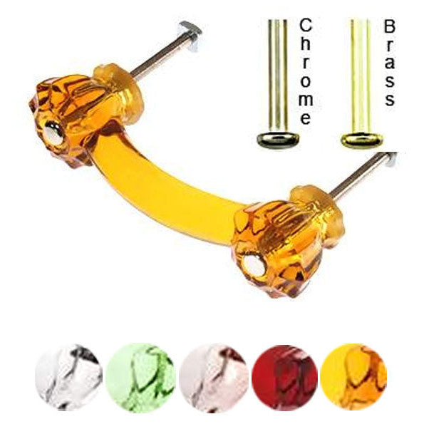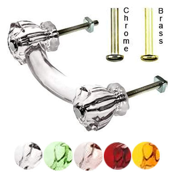 Crystal clear glass pulls - for drawers, cabinets, furniture, bathroom vanities, dressers, and restoration of vintage furniture. Glass drawer pulls have a projection of 1 3/8 inches (35 mm), a width of 1 1/4 inches (32 mm), an overall length of 4 1/4 inches (108 mm). Center to center mounting distance of 3 inches (76.2 mm 3.00 c-c). Sold individually and come with the 2 1/2 inch Chrome mounting hardware (other hardware options available).