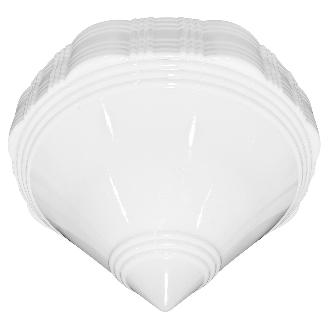 This milk glass shade measures approximately 15 inches in diameter while the shade mouth measures approximately 6 inch in diameter and it works with a 6 inch fitter system. This item is made in a white milk glass. This glass shade has an approximate 12 1/2 inch drop.