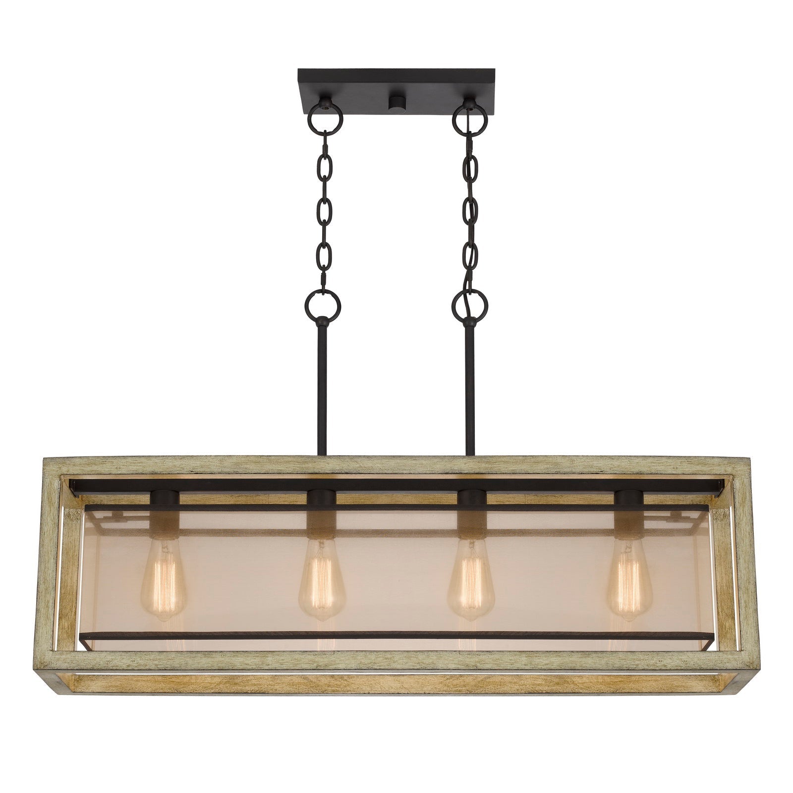 The Palencia Rubber Wood Island Chandelier, model FX-3781-4H, beautifully combines durable metal and wood construction with a chic organza fabric shade. This elegant chandelier features a rectangular wooden frame and includes a canopy for easy hardwired installation. With a 6-foot chain for adjustable height, it can enhance the ambiance of any kitchen or living room. This versatile fixture accommodates four E12 base bulbs (maximum wattage of 60W each), making it a functional and stylish addition to your home decor. Minor assembly is required, and it comes with a one-year warranty for added peace of mind.
