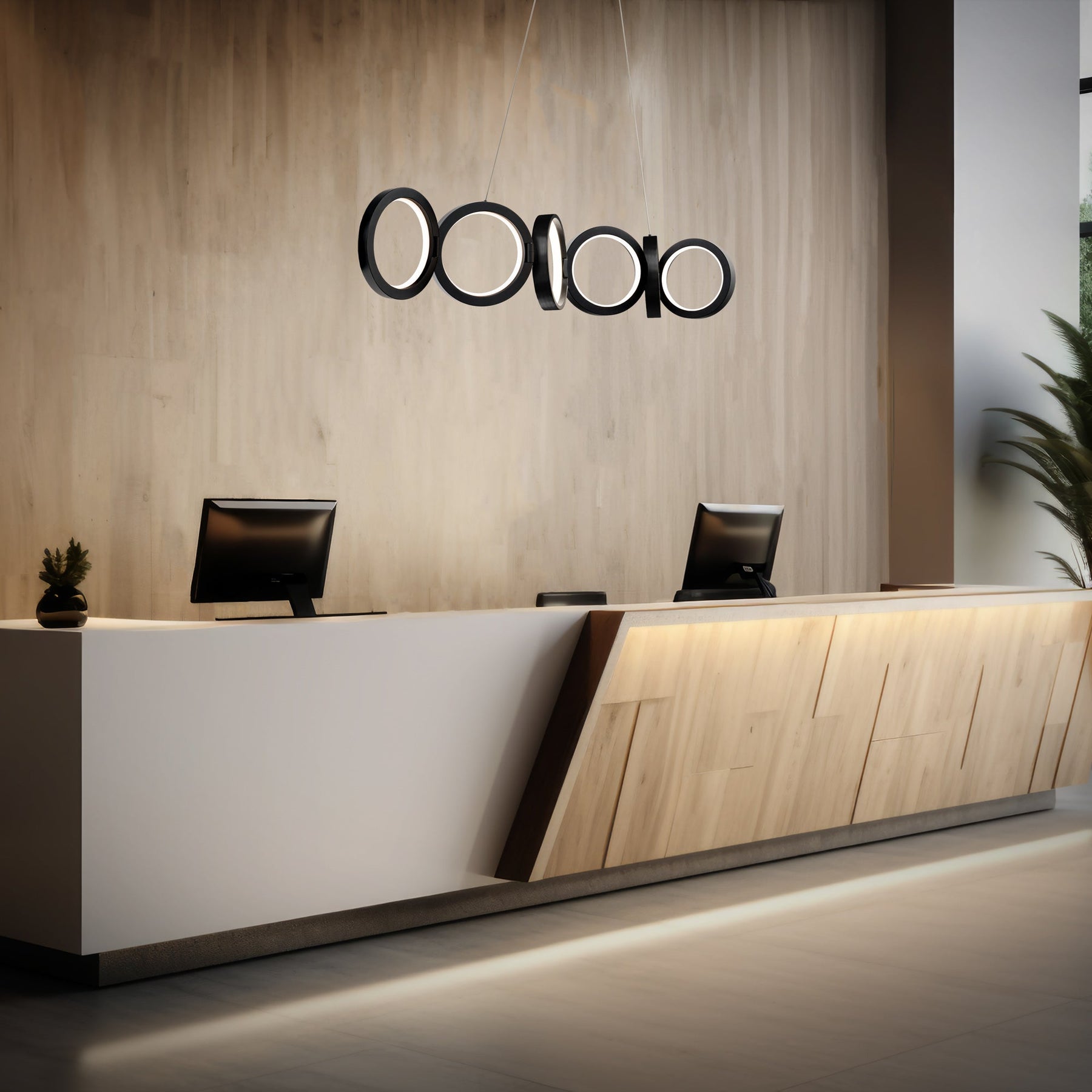Cabot 48in LED Linear Pendant 3000K in Black. In the round. Rings of light glow softly through flush opal diffusers. Perfectly tethered to each other, this foldable design can be adjusted as desired along its linear length. Featuring an extruded aluminum body, with acrylic diffusers and adjustable rings Ultra-sleek electrified cable eliminates the need for clunky power wires. Height is simple to adjust through push pin connectors on the canopy. Sloped ceiling compatible. Driver is located in the canopy and installs within a junction box. Smooth and continuous dimming with an electronic low voltage (ELV) or TRIAC dimmer. High Powered Replaceable LED Module CRI: 90, Rated Hours: 50,000, Selectable Color Temp: 2700K-3000K-3500K-4000K Standards: ETL & cETL UL 1598 listed for Damp Locations.