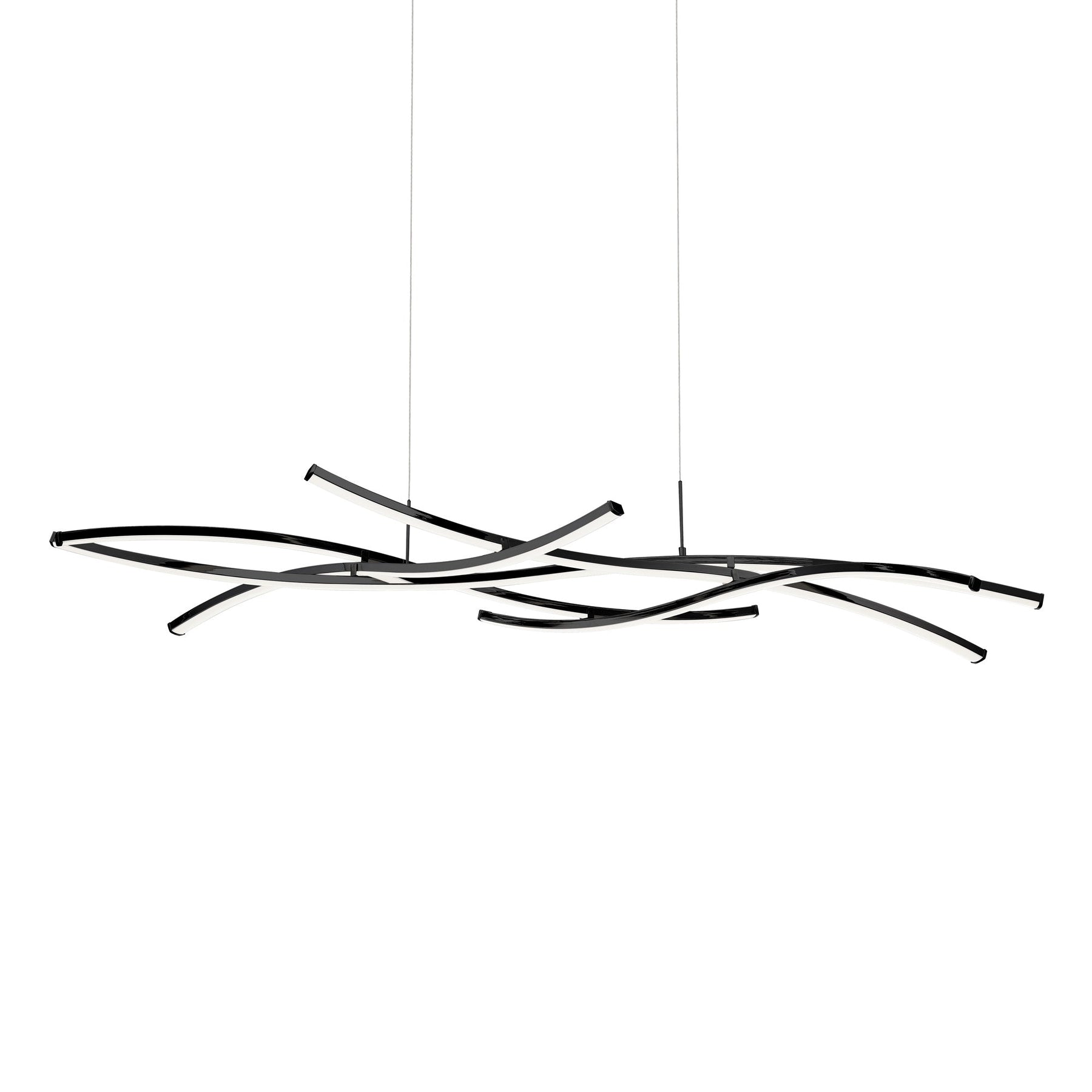 Divergence 66in LED Linear Chandelier 3000K in Black. Flowing bands of light converge in this unique and striking pendant. Energy efficient integrated LED's provide a long-lasting maintenance-free bright and even illumination. Ultra-sleek electrified cable eliminates the need for clunky power wires. Height is simple to adjust through push pin connectors on the canopy. Aluminum extruded body with composite diffuser. Can be mounted on a slope ceiling. Ultra-sleek electrified cable eliminates the need for clunky power wires. Height is simple to adjust through push pin connectors on the canopy. Driver concealed within the canopy. Custom CCT options available by special order. Smooth and continuous dimming with an electronic low voltage (ELV) dimmer. High Powered Replaceable LED Module CRI: 90, Rated Hours: 50,000, Color Temp: 3000K Standards: ETL & cETL UL 1598 listed for Damp Locations. CEC Title 24 Compliant.