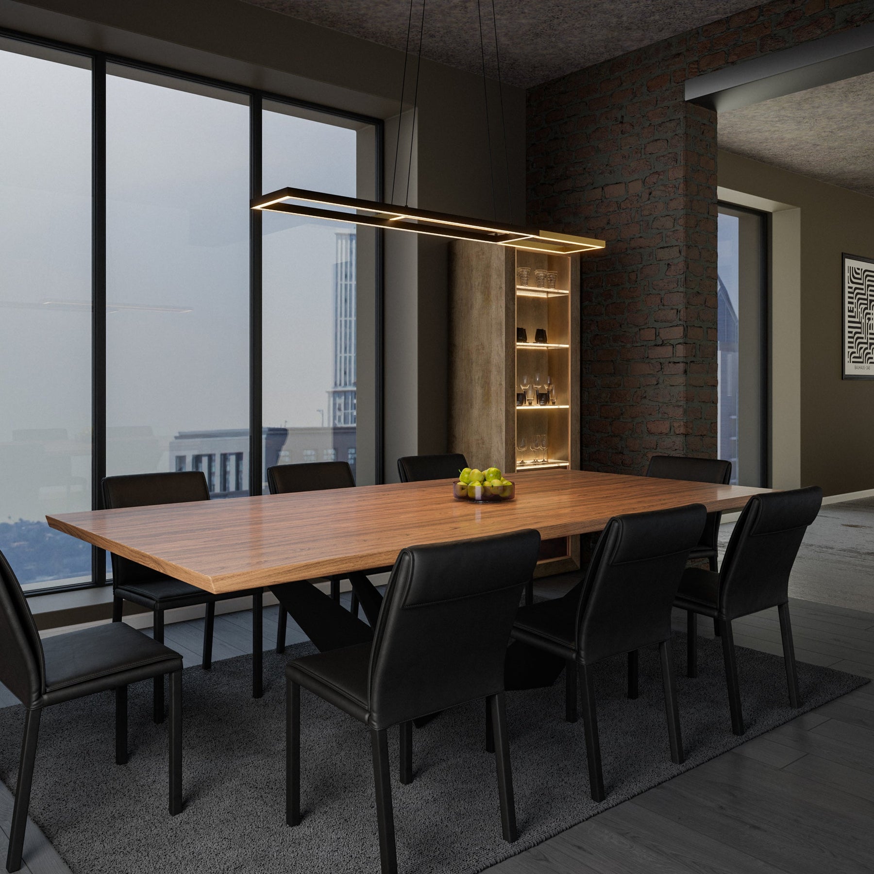 Double Entendre 42in LED Linear Pendant 3000K in Black Aged Brass. Double vision. The slim, dual-toned design of the airy rectangular framework floats effortlessly in mid-air while providing twice the amount of warm, LED down light. Featuring aluminum body construction with silicon diffusers Ultra-sleek electrified cable eliminates the need for clunky power wires. Height is simple to adjust through push pin connectors on the canopy. Sloped ceiling compatible. Universal Input Voltage Driver (120V-240V-277V) concealed in the canopy. Smooth and continuous dimming with an electronic low voltage (ELV) or TRIAC dimmer. High Powered Replaceable LED Module CRI: 90, Rated Hours: 50,000, Selectable Color Temp: 2700K-3000K-3500K-4000K Standards: ETL & cETL UL 1598 listed for Damp Locations.