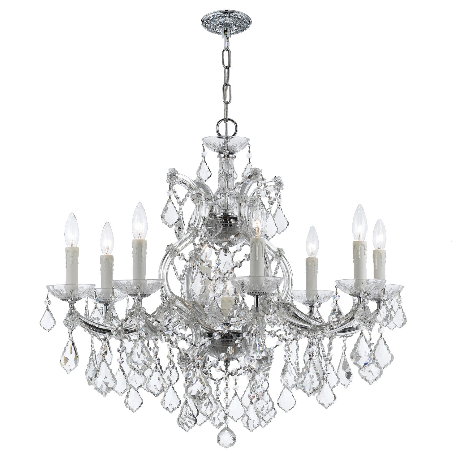 Draped in an abundance of crystal, the Maria Theresa collection is the epitome of high style. The fixture is stunning with glass arm frame decked with strands of faceted cut crystal. The fixture showcase opulence and decadence and is the perfect traditional accent to any space. Whether in a living room, or even closet or hallway, this fixture bring a luxurious addition to any decor.