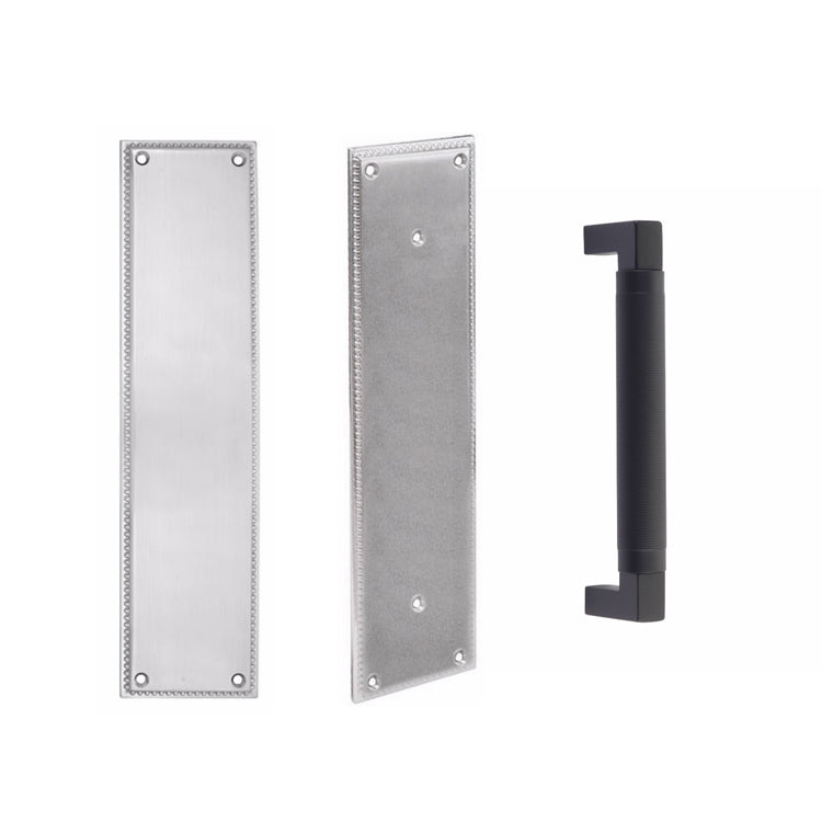 This push & pull door set is designed for any door in your home or business (such as entryway or hallway doors). It is constructed from solid brass and measures 3 inch wide by 12 inches tall. The handle C-to-C measures 8 Inches. The handle is Concealed Surface mounted. Comes in a variety of finishes.