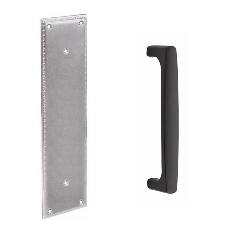 This pull plate set is designed for any door in your home or business (such as entryway or hallway doors). It is constructed from solid brass and measures 3 inch wide by 12 inches tall. The handle C-to-C measures 8 Inches. The handle is Concealed Surface mounted. Comes in a variety of finishes.